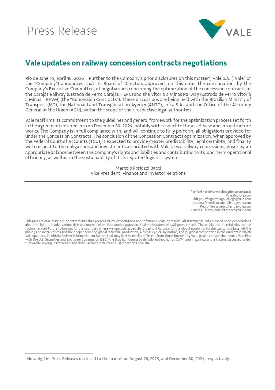Vale updates on railway concession contracts negotiations Rio de Janeiro, April 16, 2026 – Further to the Company’s prior disclosures on this matter1, Vale S.A. (“Vale” or the “Company”) announces that its Board of Directors approved, on this date, the continuation, by the Company’s Executive Committee, of negotiations concerning the optimization of the concession contracts of the Carajás Railway (Estrada de Ferro Carajás – EFC) and the Vitória a Minas Railway (Estrada de Ferro Vitória a Minas – EFVM) (the “Concession Contracts”). These discussions are being held with the Brazilian Ministry of Transport (MT), the National Land Transportation Agency (ANTT), Infra S.A., and the Office of the Attorney General of the Union (AGU), within the scope of their respective legal authorities. Vale reaffirms its commitment to the guidelines and general framework for the optimization process set forth in the agreement entered into on December 30, 2024, notably with respect to the asset base and infrastructure works. The Company is in full compliance with, and will continue to fully perform, all obligations provided for under the Concession Contracts. The conclusion of the Concession Contracts optimization, when approved by the Federal Court of Accounts (TCU), is expected to provide greater predictability, legal certainty, and finality with respect to the obligations and investments associated with Vale’s two railway concessions, ensuring an appropriate balance between the Company’s rights and liabilities and contributing to its long‑term operational efficiency, as well as to the sustainability of its integrated logistics system. Marcelo Feriozzi Bacci Vice President, Finance and Investor Relations For further information, please contact: Vale.RI@vale.com Thiago Lofiego: thiago.lofiego@vale.com Luciana Oliveti: luciana.oliveti@vale.com Pedro Terra: pedro.terra@vale.com Patricia Tinoco: patricia.tinoco@vale.com This press release may include statements that present Vale’s expectations about future events or results. All statements, when based upon expectations about the future, involve various risks and uncertainties. Vale cannot guarantee that such statements will prove correct. These risks and uncertainties include factors related to the following: (a) the countries where we operate, especially Brazil and Canada; (b) the global economy; (c) the capital markets; (d) the mining and metals prices and their dependence on global industrial production, which is cyclical by nature; and (e) global competition in the markets in which Vale operates. To obtain further information on factors that may lead to results different from those forecast by Vale, please consult the reports Vale files with the U.S. Securities and Exchange Commission (SEC), the Brazilian Comissão de Valores Mobiliários (CVM) and in particular the factors discussed under “Forward-Looking Statements” and “Risk Factors” in Vale’s annual report on Form 20-F. 1 Notably, the Press Releases disclosed to the market on August 28, 2025, and December 30, 2024, respectively. Press Release