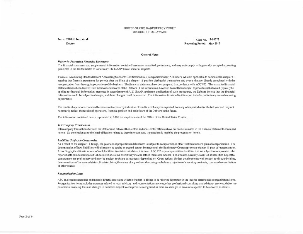 reorganization from the ongoing operations of the business. The financial statements have been prepared in accordance with ASC 852. The unaudited financial