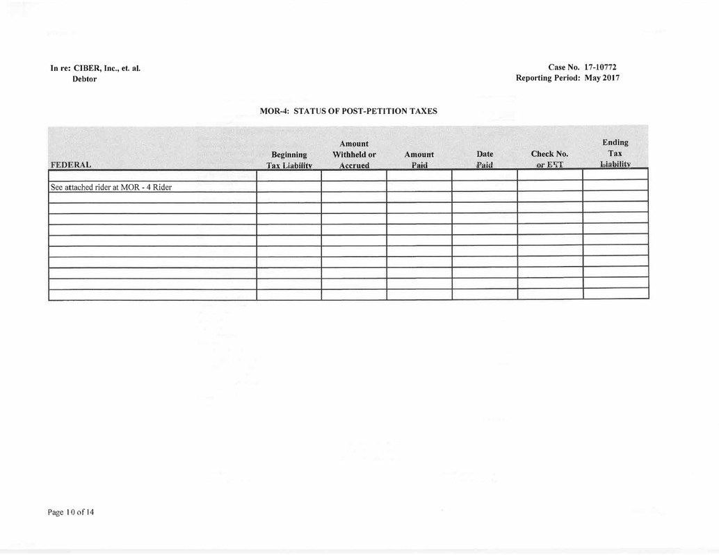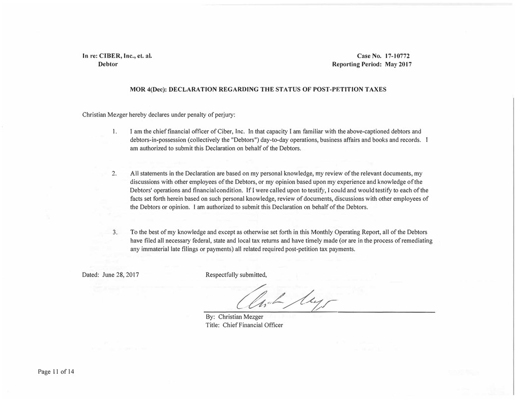 MOR 4(Dec): DECLARATION REGARDING THE STATUS OF POST-PETITION TAXES