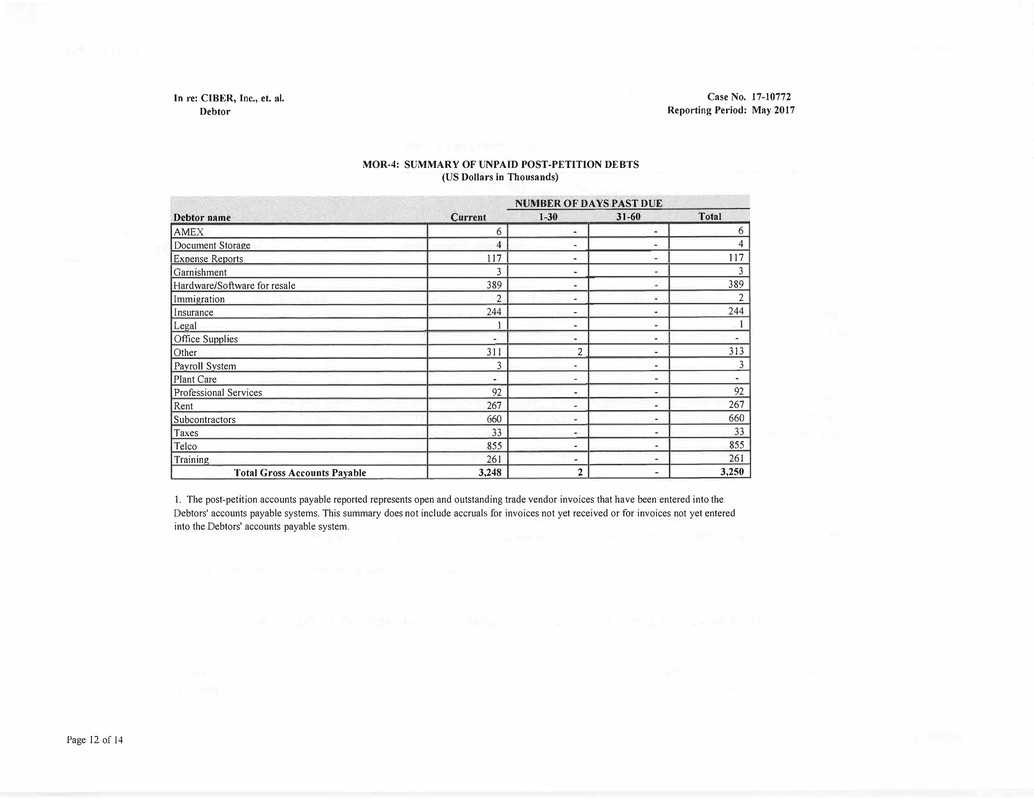 1. The post-petition accounts payable reported represents open and outstanding trade vendor invoices that have been entered into the