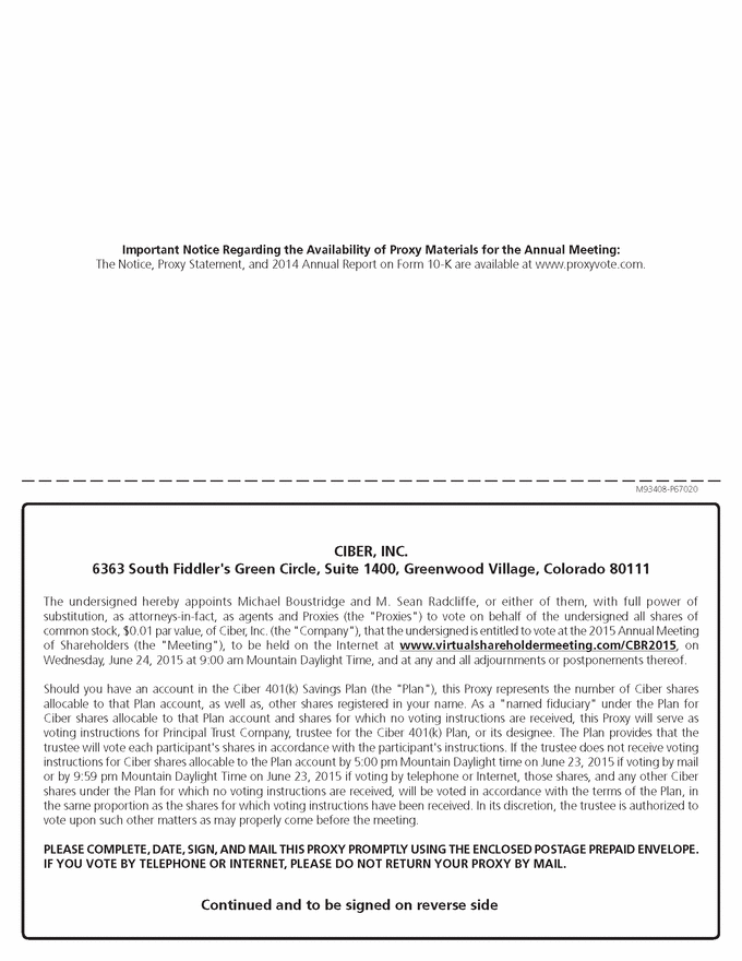 M93408-P67020 Important Notice Regarding the Availability of Proxy Materials for the Annual Meeting: The Notice, Proxy Statement, and 2014 Annual Report on Form 10-K are available at www.proxyvote.com. CIBER, INC. 6363 South Fiddler's Green Circle, Suite 1400, Greenwood Village, Colorado 80111 The undersigned hereby appoints Michael Boustridge and M. Sean Radcliffe, or either of them, with full power of substitution, as attorneys-in-fact, as agents and Proxies (the "Proxies") to vote on behalf of the undersigned all shares of common stock, $0.01 par value, of Ciber, Inc. (the "Company"), that the undersigned is entitled to vote at the 2015 Annual Meeting of Shareholders (the "Meeting"), to be held on the Internet at www.virtualshareholdermeeting.com/CBR2015, on Wednesday, June 24, 2015 at 9:00 am Mountain Daylight Time, and at any and all adjournments or postponements thereof. Should you have an account in the Ciber 401(k) Savings Plan (the "Plan"), this Proxy represents the number of Ciber shares allocable to that Plan account, as well as, other shares registered in your name. As a "named fiduciary" under the Plan for Ciber shares allocable to that Plan account and shares for which no voting instructions are received, this Proxy will serve as voting instructions for Principal Trust Company, trustee for the Ciber 401(k) Plan, or its designee. The Plan provides that the trustee will vote each participant's shares in accordance with the participant's instructions. If the trustee does not receive voting instructions for Ciber shares allocable to the Plan account by 5:00 pm Mountain Daylight time on June 23, 2015 if voting by mail or by 9:59 pm Mountain Daylight Time on June 23, 2015 if voting by telephone or Internet, those shares, and any other Ciber shares under the Plan for which no voting instructions are received, will be voted in accordance with the terms of the Plan, in the same proportion as the shares for which voting instructions have been received. In its discretion, the trustee is authorized to vote upon such other matters as may properly come before the meeting. PLEASE COMPLETE, DATE, SIGN, AND MAIL THIS PROXY PROMPTLY USING THE ENCLOSED POSTAGE PREPAID ENVELOPE. IF YOU VOTE BY TELEPHONE OR INTERNET, PLEASE DO NOT RETURN YOUR PROXY BY MAIL. Continued and to be signed on reverse side |