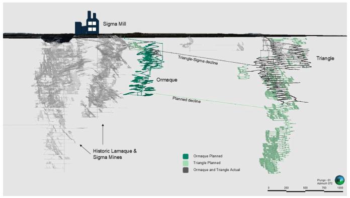 Ormaque is located within the Lamaque Complex and benefits from existing infrastructure, including underground access developed from the Triangle–Sigma decline and proximity to the Sigma Mill (Figure 1). The addition of Ormaque enhances Lamaque’s production flexibility by providing an additional source of high-grade feed that will be sequenced and blended alongside ore from the Triangle deposit.