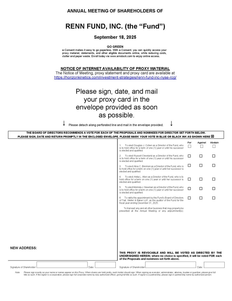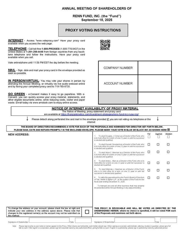 NOTICE IS HEREBY GIVEN that the Annual Meeting of Shareholders (the “Annual Meeting”) of RENN Fund, Inc., a Texas corporation (the “Fund”), will be held at the offices of Horizon Kinetics Asset Management LLC (the “Advisor”), 470 Park Avenue South, 3rd Floor South, New York, NY 10016 on September 18, 2025 at 2:00 pm EST. The Annual Meeting will also be held in a virtual format conducted via live audio webcast for the following purposes: