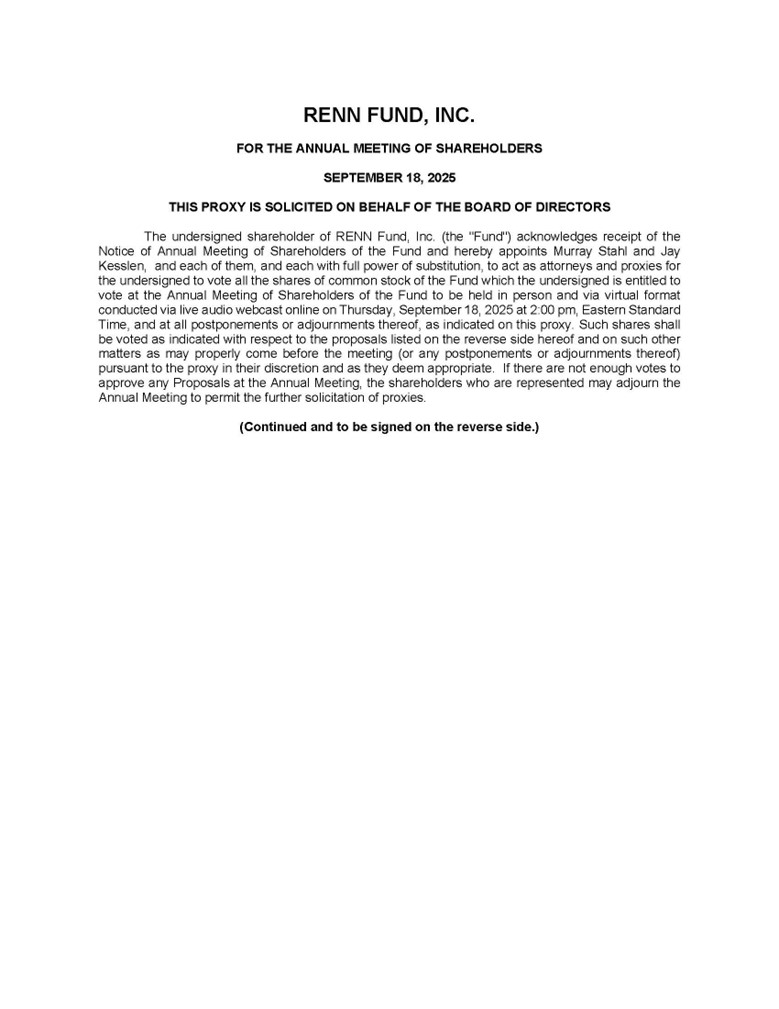 This Proxy Statement is being furnished to the shareholders of RENN Fund, Inc., a Texas corporation (the “Fund”). The Fund’s Board of Directors is soliciting proxies to be voted at the Annual Meeting of Shareholders (the “Annual Meeting”) to be held at the offices of Horizon Kinetics Asset Management LLC, 470 Park Avenue South, 3rd Floor South, New York, NY 10016 on Thursday, September 18, 2025, at 2:00 PM Eastern Standard Time, and at any adjournment(s). The Annual Meeting will also be held in a virtual format conducted via live audio webcast. This Proxy Statement is being sent to Shareholders on or about July 11, 2025.