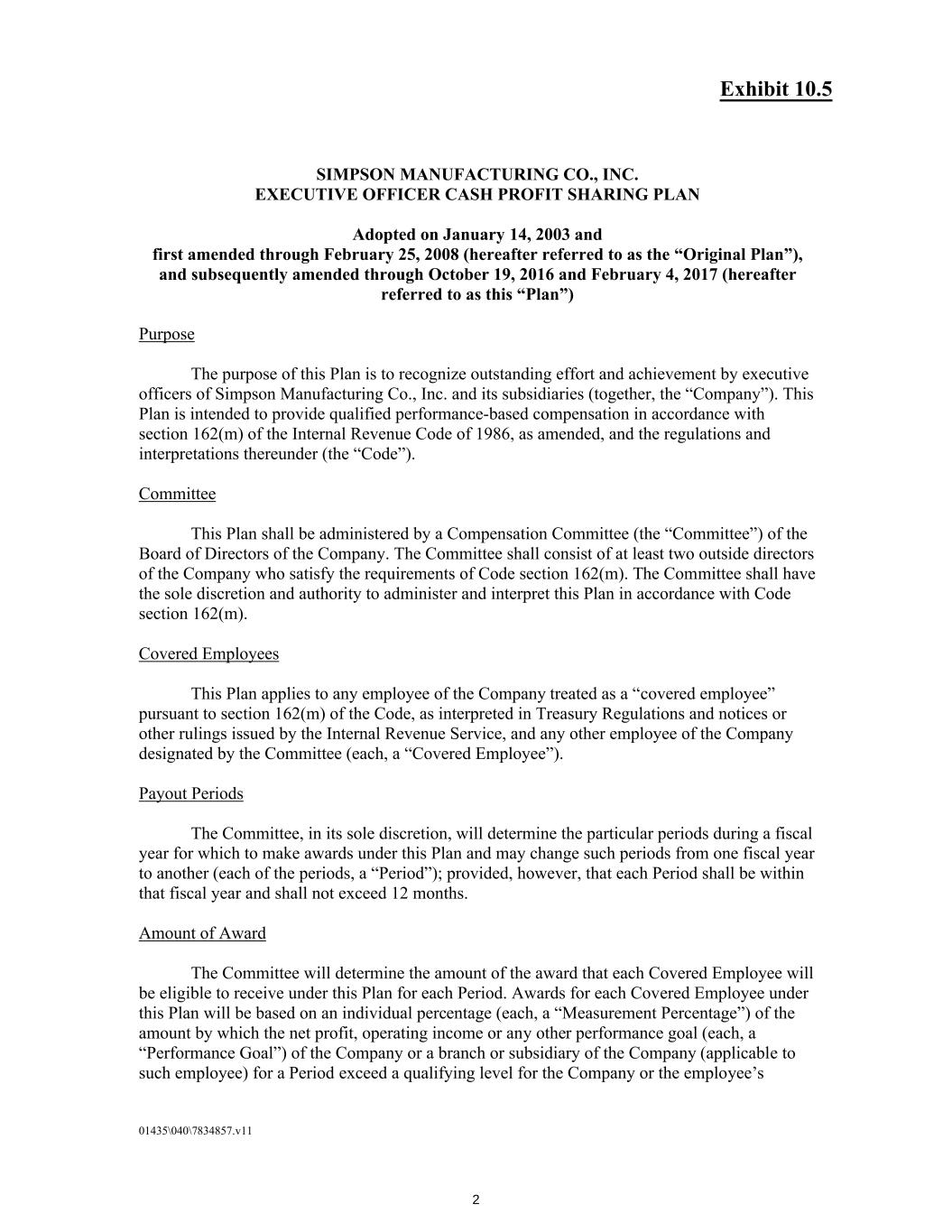 01435\040\7834857.v11 SIMPSON MANUFACTURING CO., INC. EXECUTIVE OFFICER CASH PROFIT SHARING PLAN Adopted on January 14, 2003 and first amended through February 25, 2008 (hereafter referred to as the “Original Plan”), and subsequently amended through October 19, 2016 and February 4, 2017 (hereafter referred to as this “Plan”) Purpose The purpose of this Plan is to recognize outstanding effort and achievement by executive officers of Simpson Manufacturing Co., Inc. and its subsidiaries (together, the “Company”). This Plan is intended to provide qualified performance-based compensation in accordance with section 162(m) of the Internal Revenue Code of 1986, as amended, and the regulations and interpretations thereunder (the “Code”). Committee This Plan shall be administered by a Compensation Committee (the “Committee”) of the Board of Directors of the Company. The Committee shall consist of at least two outside directors of the Company who satisfy the requirements of Code section 162(m). The Committee shall have the sole discretion and authority to administer and interpret this Plan in accordance with Code section 162(m). Covered Employees This Plan applies to any employee of the Company treated as a “covered employee” pursuant to section 162(m) of the Code, as interpreted in Treasury Regulations and notices or other rulings issued by the Internal Revenue Service, and any other employee of the Company designated by the Committee (each, a “Covered Employee”). Payout Periods The Committee, in its sole discretion, will determine the particular periods during a fiscal year for which to make awards under this Plan and may change such periods from one fiscal year to another (each of the periods, a “Period”); provided, however, that each Period shall be within that fiscal year and shall not exceed 12 months. Amount of Award The Committee will determine the amount of the award that each Covered Employee will be eligible to receive under this Plan for each Period. Awards for each Covered Employee under this Plan will be based on an individual percentage (each, a “Measurement Percentage”) of the amount by which the net profit, operating income or any other performance goal (each, a “Performance Goal”) of the Company or a branch or subsidiary of the Company (applicable to such employee) for a Period exceed a qualifying level for the Company or the employee’s Simpson Manufacturing Co., Inc. - Approval of Executive Officer Cash Profit Sharing Plan- Brian Magstadt 2 Exhibit 10.5
