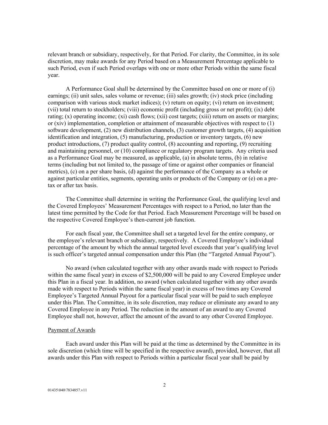 2 01435\040\7834857.v11 relevant branch or subsidiary, respectively, for that Period. For clarity, the Committee, in its sole discretion, may make awards for any Period based on a Measurement Percentage applicable to such Period, even if such Period overlaps with one or more other Periods within the same fiscal year. A Performance Goal shall be determined by the Committee based on one or more of (i) earnings; (ii) unit sales, sales volume or revenue; (iii) sales growth; (iv) stock price (including comparison with various stock market indices); (v) return on equity; (vi) return on investment; (vii) total return to stockholders; (viii) economic profit (including gross or net profit); (ix) debt rating; (x) operating income; (xi) cash flows; (xii) cost targets; (xiii) return on assets or margins; or (xiv) implementation, completion or attainment of measurable objectives with respect to (1) software development, (2) new distribution channels, (3) customer growth targets, (4) acquisition identification and integration, (5) manufacturing, production or inventory targets, (6) new product introductions, (7) product quality control, (8) accounting and reporting, (9) recruiting and maintaining personnel, or (10) compliance or regulatory program targets. Any criteria used as a Performance Goal may be measured, as applicable, (a) in absolute terms, (b) in relative terms (including but not limited to, the passage of time or against other companies or financial metrics), (c) on a per share basis, (d) against the performance of the Company as a whole or against particular entities, segments, operating units or products of the Company or (e) on a pre- tax or after tax basis. The Committee shall determine in writing the Performance Goal, the qualifying level and the Covered Employees’ Measurement Percentages with respect to a Period, no later than the latest time permitted by the Code for that Period. Each Measurement Percentage will be based on the respective Covered Employee’s then-current job function. For each fiscal year, the Committee shall set a targeted level for the entire company, or the employee’s relevant branch or subsidiary, respectively. A Covered Employee’s individual percentage of the amount by which the annual targeted level exceeds that year’s qualifying level is such officer’s targeted annual compensation under this Plan (the “Targeted Annual Payout”). No award (when calculated together with any other awards made with respect to Periods within the same fiscal year) in excess of $2,500,000 will be paid to any Covered Employee under this Plan in a fiscal year. In addition, no award (when calculated together with any other awards made with respect to Periods within the same fiscal year) in excess of two times any Covered Employee’s Targeted Annual Payout for a particular fiscal year will be paid to such employee under this Plan. The Committee, in its sole discretion, may reduce or eliminate any award to any Covered Employee in any Period. The reduction in the amount of an award to any Covered Employee shall not, however, affect the amount of the award to any other Covered Employee. Payment of Awards Each award under this Plan will be paid at the time as determined by the Committee in its sole discretion (which time will be specified in the respective award), provided, however, that all awards under this Plan with respect to Periods within a particular fiscal year shall be paid by Simpson Manufacturing Co., Inc. - Approval of Executive Officer Cash Profit Sharing Plan- Brian Magstadt 3