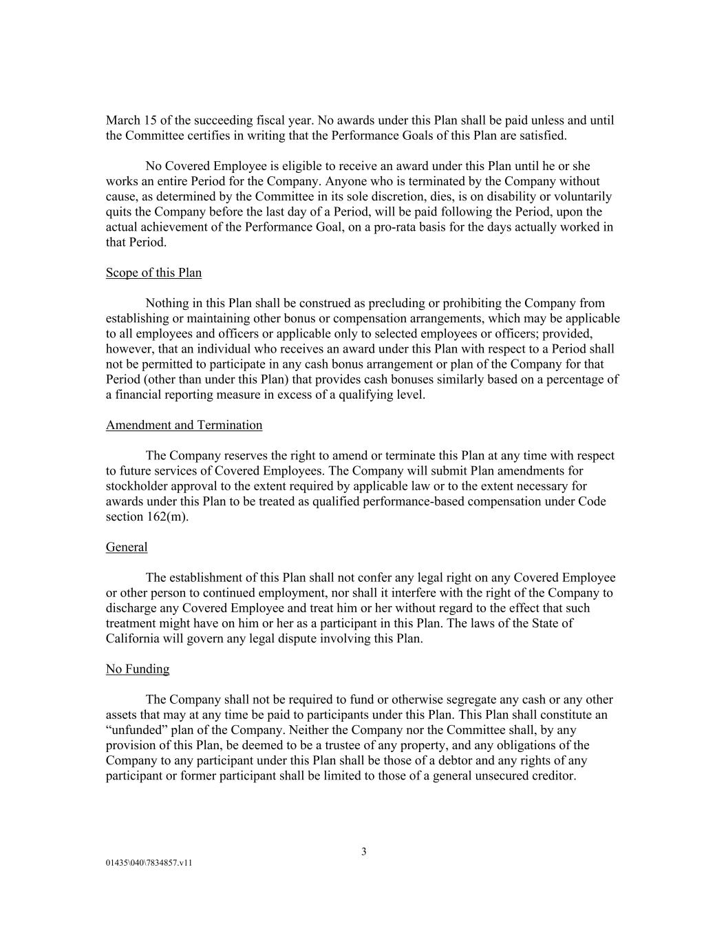 3 01435\040\7834857.v11 March 15 of the succeeding fiscal year. No awards under this Plan shall be paid unless and until the Committee certifies in writing that the Performance Goals of this Plan are satisfied. No Covered Employee is eligible to receive an award under this Plan until he or she works an entire Period for the Company. Anyone who is terminated by the Company without cause, as determined by the Committee in its sole discretion, dies, is on disability or voluntarily quits the Company before the last day of a Period, will be paid following the Period, upon the actual achievement of the Performance Goal, on a pro-rata basis for the days actually worked in that Period. Scope of this Plan Nothing in this Plan shall be construed as precluding or prohibiting the Company from establishing or maintaining other bonus or compensation arrangements, which may be applicable to all employees and officers or applicable only to selected employees or officers; provided, however, that an individual who receives an award under this Plan with respect to a Period shall not be permitted to participate in any cash bonus arrangement or plan of the Company for that Period (other than under this Plan) that provides cash bonuses similarly based on a percentage of a financial reporting measure in excess of a qualifying level. Amendment and Termination The Company reserves the right to amend or terminate this Plan at any time with respect to future services of Covered Employees. The Company will submit Plan amendments for stockholder approval to the extent required by applicable law or to the extent necessary for awards under this Plan to be treated as qualified performance-based compensation under Code section 162(m). General The establishment of this Plan shall not confer any legal right on any Covered Employee or other person to continued employment, nor shall it interfere with the right of the Company to discharge any Covered Employee and treat him or her without regard to the effect that such treatment might have on him or her as a participant in this Plan. The laws of the State of California will govern any legal dispute involving this Plan. No Funding The Company shall not be required to fund or otherwise segregate any cash or any other assets that may at any time be paid to participants under this Plan. This Plan shall constitute an “unfunded” plan of the Company. Neither the Company nor the Committee shall, by any provision of this Plan, be deemed to be a trustee of any property, and any obligations of the Company to any participant under this Plan shall be those of a debtor and any rights of any participant or former participant shall be limited to those of a general unsecured creditor. Simpson Manufacturing Co., Inc. - Approval of Executive Officer Cash Profit Sharing Plan- Brian Magstadt 4