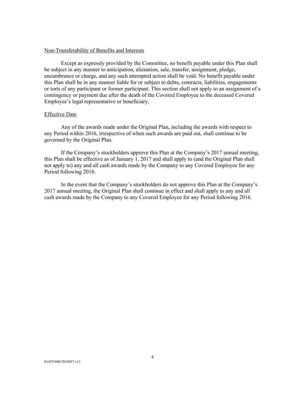 4 01435\040\7834857.v11 Non-Transferability of Benefits and Interests Except as expressly provided by the Committee, no benefit payable under this Plan shall be subject in any manner to anticipation, alienation, sale, transfer, assignment, pledge, encumbrance or charge, and any such attempted action shall be void. No benefit payable under this Plan shall be in any manner liable for or subject to debts, contracts, liabilities, engagements or torts of any participant or former participant. This section shall not apply to an assignment of a contingency or payment due after the death of the Covered Employee to the deceased Covered Employee’s legal representative or beneficiary. Effective Date Any of the awards made under the Original Plan, including the awards with respect to any Period within 2016, irrespective of when such awards are paid out, shall continue to be governed by the Original Plan. If the Company’s stockholders approve this Plan at the Company’s 2017 annual meeting, this Plan shall be effective as of January 1, 2017 and shall apply to (and the Original Plan shall not apply to) any and all cash awards made by the Company to any Covered Employee for any Period following 2016. In the event that the Company’s stockholders do not approve this Plan at the Company’s 2017 annual meeting, the Original Plan shall continue in effect and shall apply to any and all cash awards made by the Company to any Covered Employee for any Period following 2016. Simpson Manufacturing Co., Inc. - Approval of Executive Officer Cash Profit Sharing Plan- Brian Magstadt 5