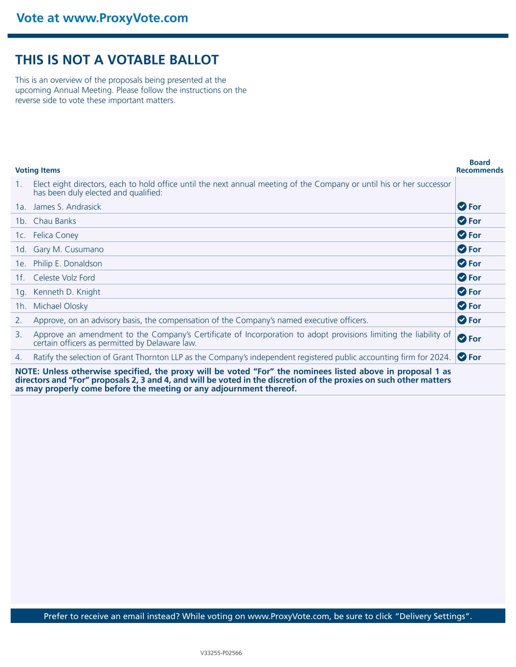 THIS IS NOT A VOTABLE BALLOT This is an overview of the proposals being presented at the upcoming Annual Meeting. Please follow the instructions on the reverse side to vote these important matters. Vote at www.ProxyVote.com Prefer to receive an email instead? While voting on www.ProxyVote.com, be sure to click “Delivery Settings”. Voting Items Board Recommends V33255-P02566 1. Elect eight directors, each to hold office until the next annual meeting of the Company or until his or her successor has been duly elected and qualified: 1a. James S. Andrasick For 1b. Chau Banks For 1c. Felica Coney For 1d. Gary M. Cusumano For 1e. Philip E. Donaldson For 1f. Celeste Volz Ford For 1g. Kenneth D. Knight For 1h. Michael Olosky For 2. Approve, on an advisory basis, the compensation of the Company’s named executive officers. For 3. Approve an amendment to the Company’s Certificate of Incorporation to adopt provisions limiting the liability of certain officers as permitted by Delaware law. For 4. Ratify the selection of Grant Thornton LLP as the Company’s independent registered public accounting firm for 2024. For NOTE: Unless otherwise specified, the proxy will be voted “For” the nominees listed above in proposal 1 as directors and “For” proposals 2, 3 and 4, and will be voted in the discretion of the proxies on such other matters as may properly come before the meeting or any adjournment thereof.