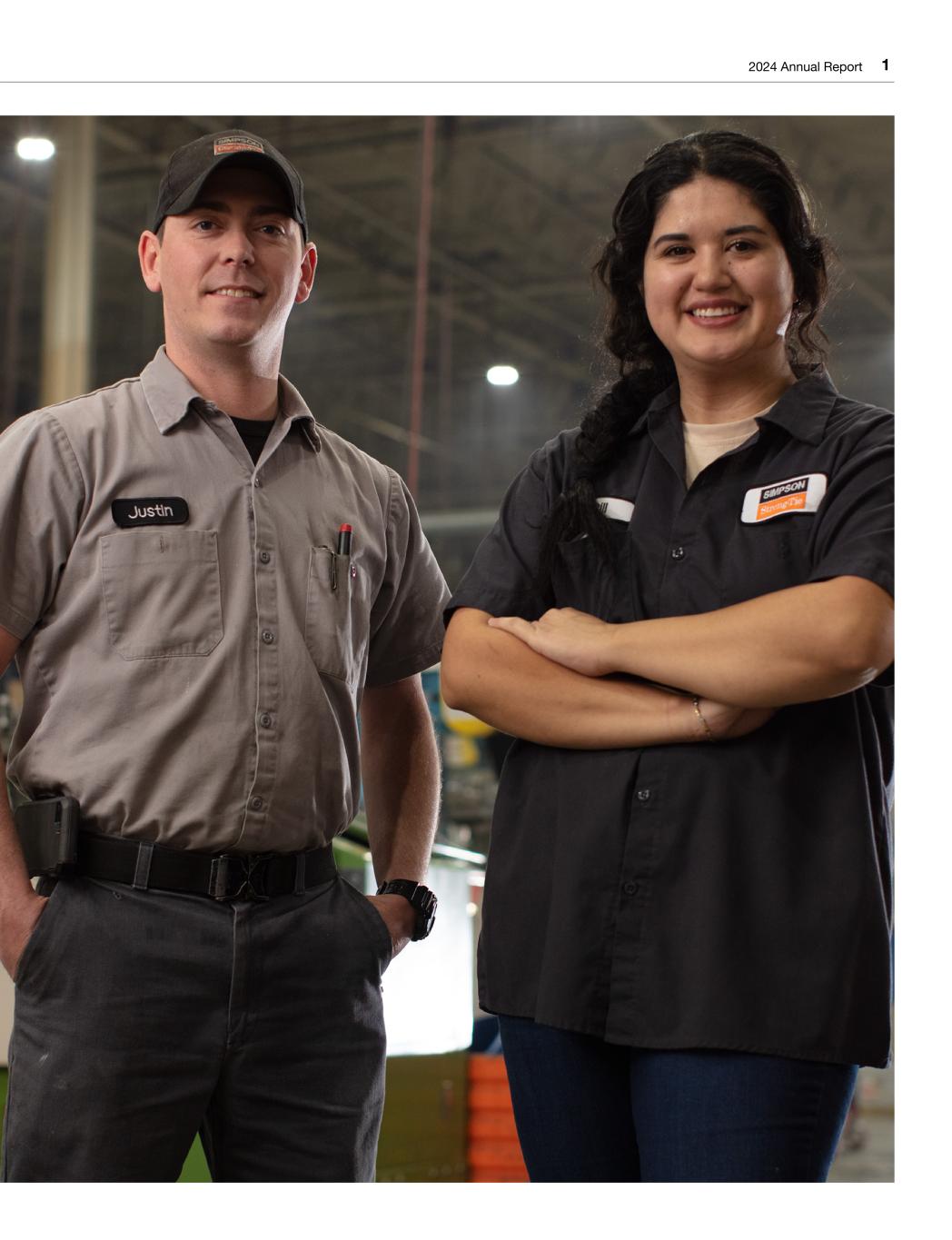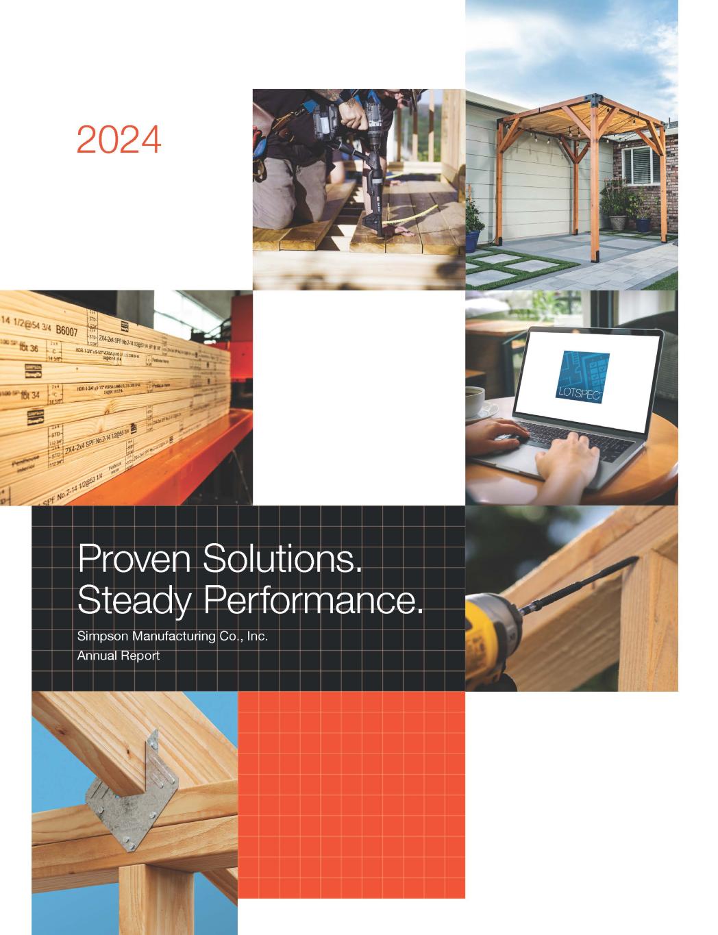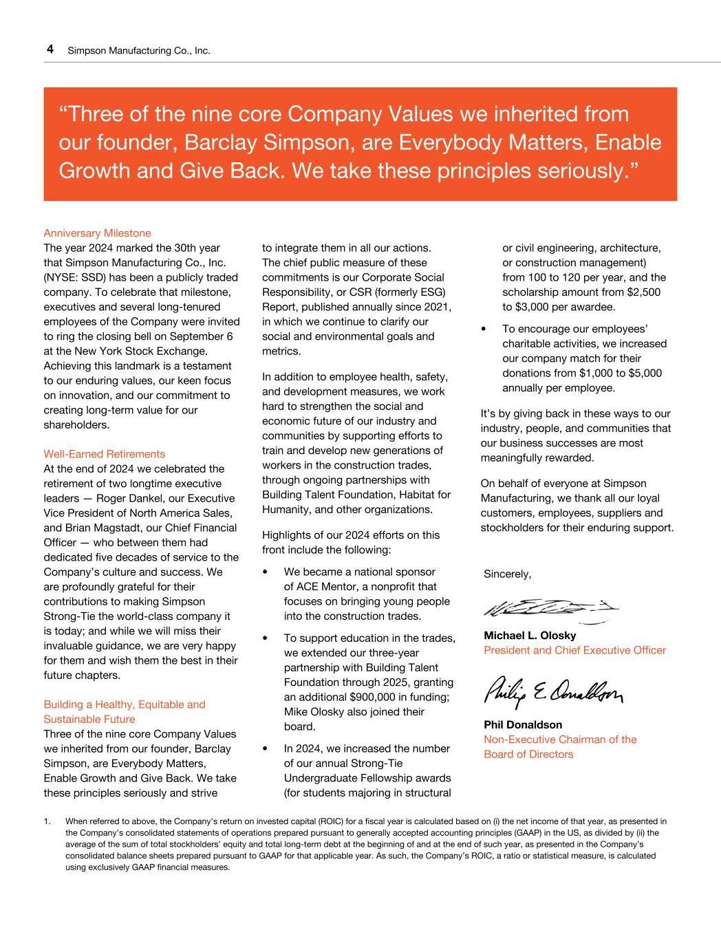 “Three of the nine core Company Values we inherited from our founder, Barclay Simpson, are Everybody Matters, Enable Growth and Give Back. We take these principles seriously.” Anniversary Milestone The year 2024 marked the 30th year that Simpson Manufacturing Co., Inc. (NYSE: SSD) has been a publicly traded company. To celebrate that milestone, executives and several long-tenured employees of the Company were invited to ring the closing bell on September 6 at the New York Stock Exchange. Achieving this landmark is a testament to our enduring values, our keen focus on innovation, and our commitment to creating long-term value for our shareholders. Well-Earned Retirements At the end of 2024 we celebrated the retirement of two longtime executive leaders — Roger Dankel, our Executive Vice President of North America Sales, and Brian Magstadt, our Chief Financial Officer — who between them had dedicated five decades of service to the Company’s culture and success. We are profoundly grateful for their contributions to making Simpson Strong-Tie the world-class company it is today; and while we will miss their invaluable guidance, we are very happy for them and wish them the best in their future chapters. Building a Healthy, Equitable and Sustainable Future Three of the nine core Company Values we inherited from our founder, Barclay Simpson, are Everybody Matters, Enable Growth and Give Back. We take these principles seriously and strive to integrate them in all our actions. The chief public measure of these commitments is our Corporate Social Responsibility, or CSR (formerly ESG) Report, published annually since 2021, in which we continue to clarify our social and environmental goals and metrics. In addition to employee health, safety, and development measures, we work hard to strengthen the social and economic future of our industry and communities by supporting efforts to train and develop new generations of workers in the construction trades, through ongoing partnerships with Building Talent Foundation, Habitat for Humanity, and other organizations. Highlights of our 2024 efforts on this front include the following: • We became a national sponsor of ACE Mentor, a nonprofit that focuses on bringing young people into the construction trades. • To support education in the trades, we extended our three-year partnership with Building Talent Foundation through 2025, granting an additional $900,000 in funding; Mike Olosky also joined their board. • In 2024, we increased the number of our annual Strong-Tie Undergraduate Fellowship awards (for students majoring in structural or civil engineering, architecture, or construction management) from 100 to 120 per year, and the scholarship amount from $2,500 to $3,000 per awardee. • To encourage our employees’ charitable activities, we increased our company match for their donations from $1,000 to $5,000 annually per employee. It’s by giving back in these ways to our industry, people, and communities that our business successes are most meaningfully rewarded. On behalf of everyone at Simpson Manufacturing, we thank all our loyal customers, employees, suppliers and stockholders for their enduring support. Sincerely, Michael L. Olosky President and Chief Executive Officer Phil Donaldson Non-Executive Chairman of the Board of Directors 1. When referred to above, the Company’s return on invested capital (ROIC) for a fiscal year is calculated based on (i) the net income of that year, as presented in the Company’s consolidated statements of operations prepared pursuant to generally accepted accounting principles (GAAP) in the US, as divided by (ii) the average of the sum of total stockholders’ equity and total long-term debt at the beginning of and at the end of such year, as presented in the Company’s consolidated balance sheets prepared pursuant to GAAP for that applicable year. As such, the Company’s ROIC, a ratio or statistical measure, is calculated using exclusively GAAP financial measures. 4 Simpson Manufacturing Co., Inc.