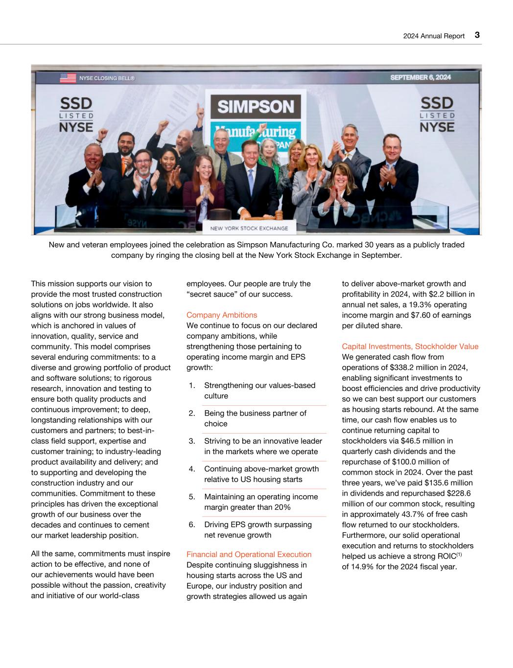 New and veteran employees joined the celebration as Simpson Manufacturing Co. marked 30 years as a publicly traded company by ringing the closing bell at the New York Stock Exchange in September. This mission supports our vision to provide the most trusted construction solutions on jobs worldwide. It also aligns with our strong business model, which is anchored in values of innovation, quality, service and community. This model comprises several enduring commitments: to a diverse and growing portfolio of product and software solutions; to rigorous research, innovation and testing to ensure both quality products and continuous improvement; to deep, longstanding relationships with our customers and partners; to best-in- class field support, expertise and customer training; to industry-leading product availability and delivery; and to supporting and developing the construction industry and our communities. Commitment to these principles has driven the exceptional growth of our business over the decades and continues to cement our market leadership position. All the same, commitments must inspire action to be effective, and none of our achievements would have been possible without the passion, creativity and initiative of our world-class employees. Our people are truly the “secret sauce” of our success. Company Ambitions We continue to focus on our declared company ambitions, while strengthening those pertaining to operating income margin and EPS growth: 1. Strengthening our values-based culture 2. Being the business partner of choice 3. Striving to be an innovative leader in the markets where we operate 4. Continuing above-market growth relative to US housing starts 5. Maintaining an operating income margin greater than 20% 6. Driving EPS growth surpassing net revenue growth Financial and Operational Execution Despite continuing sluggishness in housing starts across the US and Europe, our industry position and growth strategies allowed us again to deliver above-market growth and profitability in 2024, with $2.2 billion in annual net sales, a 19.3% operating income margin and $7.60 of earnings per diluted share. Capital Investments, Stockholder Value We generated cash flow from operations of $338.2 million in 2024, enabling significant investments to boost efficiencies and drive productivity so we can best support our customers as housing starts rebound. At the same time, our cash flow enables us to continue returning capital to stockholders via $46.5 million in quarterly cash dividends and the repurchase of $100.0 million of common stock in 2024. Over the past three years, we’ve paid $135.6 million in dividends and repurchased $228.6 million of our common stock, resulting in approximately 43.7% of free cash flow returned to our stockholders. Furthermore, our solid operational execution and returns to stockholders helped us achieve a strong ROIC(1) of 14.9% for the 2024 fiscal year. 2024 Annual Report 3