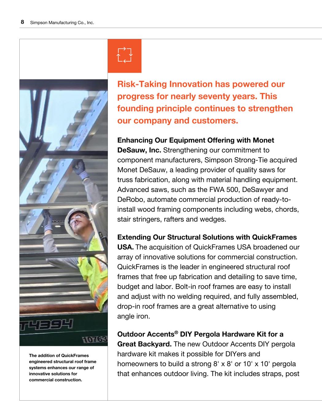 Risk-Taking Innovation has powered our progress for nearly seventy years. This founding principle continues to strengthen our company and customers. Enhancing Our Equipment Offering with Monet DeSauw, Inc. Strengthening our commitment to component manufacturers, Simpson Strong-Tie acquired Monet DeSauw, a leading provider of quality saws for truss fabrication, along with material handling equipment. Advanced saws, such as the FWA 500, DeSawyer and DeRobo, automate commercial production of ready-to- install wood framing components including webs, chords, stair stringers, rafters and wedges. Extending Our Structural Solutions with QuickFrames USA. The acquisition of QuickFrames USA broadened our array of innovative solutions for commercial construction. QuickFrames is the leader in engineered structural roof frames that free up fabrication and detailing to save time, budget and labor. Bolt-in roof frames are easy to install and adjust with no welding required, and fully assembled, drop-in roof frames are a great alternative to using angle iron. Outdoor Accents® DIY Pergola Hardware Kit for a Great Backyard. The new Outdoor Accents DIY pergola hardware kit makes it possible for DIYers and homeowners to build a strong 8' x 8' or 10' x 10' pergola that enhances outdoor living. The kit includes straps, post The addition of QuickFrames engineered structural roof frame systems enhances our range of innovative solutions for commercial construction. 8 Simpson Manufacturing Co., Inc.
