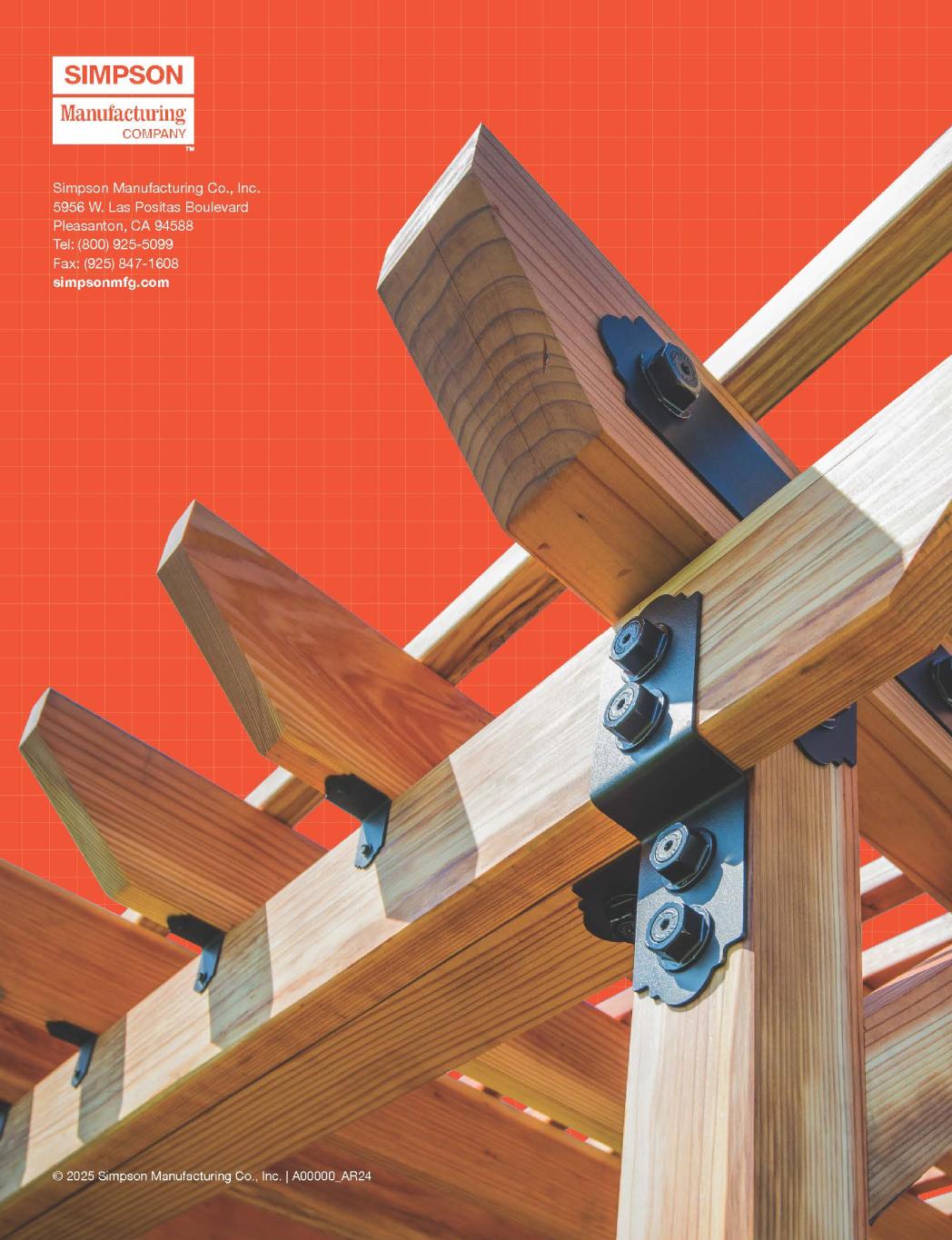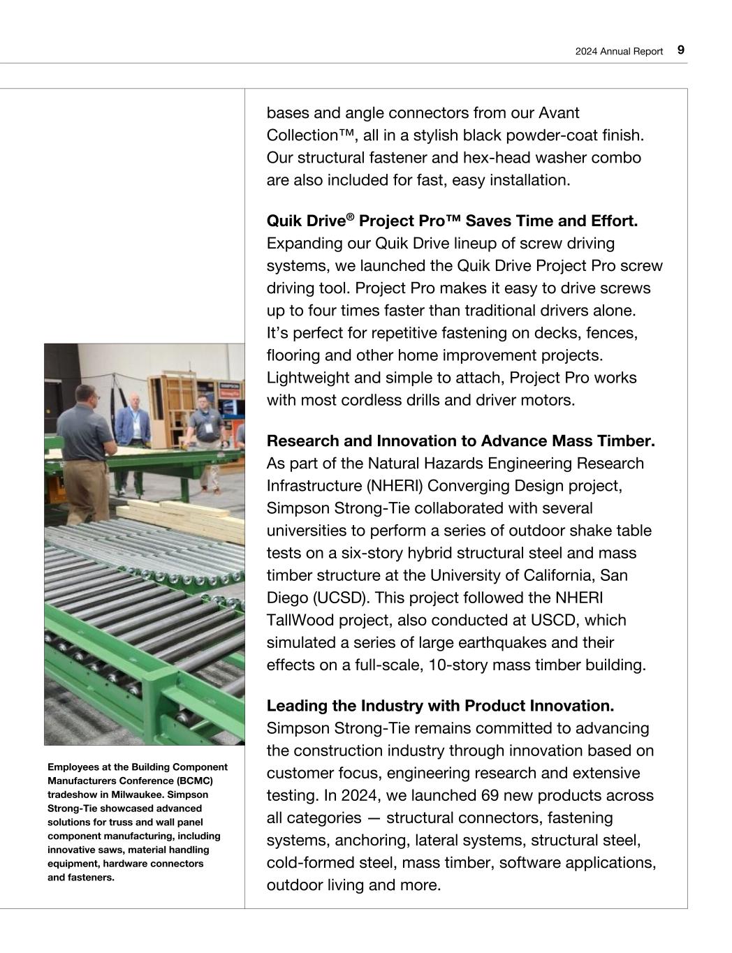 bases and angle connectors from our Avant Collection™, all in a stylish black powder-coat finish. Our structural fastener and hex-head washer combo are also included for fast, easy installation. Quik Drive® Project Pro™ Saves Time and Effort. Expanding our Quik Drive lineup of screw driving systems, we launched the Quik Drive Project Pro screw driving tool. Project Pro makes it easy to drive screws up to four times faster than traditional drivers alone. It’s perfect for repetitive fastening on decks, fences, flooring and other home improvement projects. Lightweight and simple to attach, Project Pro works with most cordless drills and driver motors. Research and Innovation to Advance Mass Timber. As part of the Natural Hazards Engineering Research Infrastructure (NHERI) Converging Design project, Simpson Strong-Tie collaborated with several universities to perform a series of outdoor shake table tests on a six-story hybrid structural steel and mass timber structure at the University of California, San Diego (UCSD). This project followed the NHERI TallWood project, also conducted at USCD, which simulated a series of large earthquakes and their effects on a full-scale, 10-story mass timber building. Leading the Industry with Product Innovation. Simpson Strong-Tie remains committed to advancing the construction industry through innovation based on customer focus, engineering research and extensive testing. In 2024, we launched 69 new products across all categories — structural connectors, fastening systems, anchoring, lateral systems, structural steel, cold-formed steel, mass timber, software applications, outdoor living and more. Employees at the Building Component Manufacturers Conference (BCMC) tradeshow in Milwaukee. Simpson Strong-Tie showcased advanced solutions for truss and wall panel component manufacturing, including innovative saws, material handling equipment, hardware connectors and fasteners. 2024 Annual Report 9