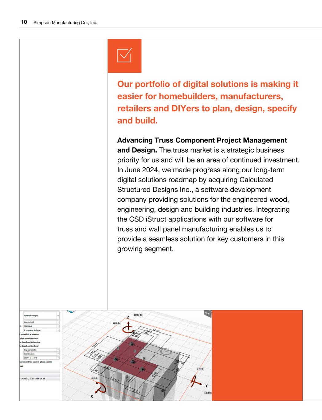 Our portfolio of digital solutions is making it easier for homebuilders, manufacturers, retailers and DIYers to plan, design, specify and build. Advancing Truss Component Project Management and Design. The truss market is a strategic business priority for us and will be an area of continued investment. In June 2024, we made progress along our long-term digital solutions roadmap by acquiring Calculated Structured Designs Inc., a software development company providing solutions for the engineered wood, engineering, design and building industries. Integrating the CSD iStruct applications with our software for truss and wall panel manufacturing enables us to provide a seamless solution for key customers in this growing segment. 10 Simpson Manufacturing Co., Inc.