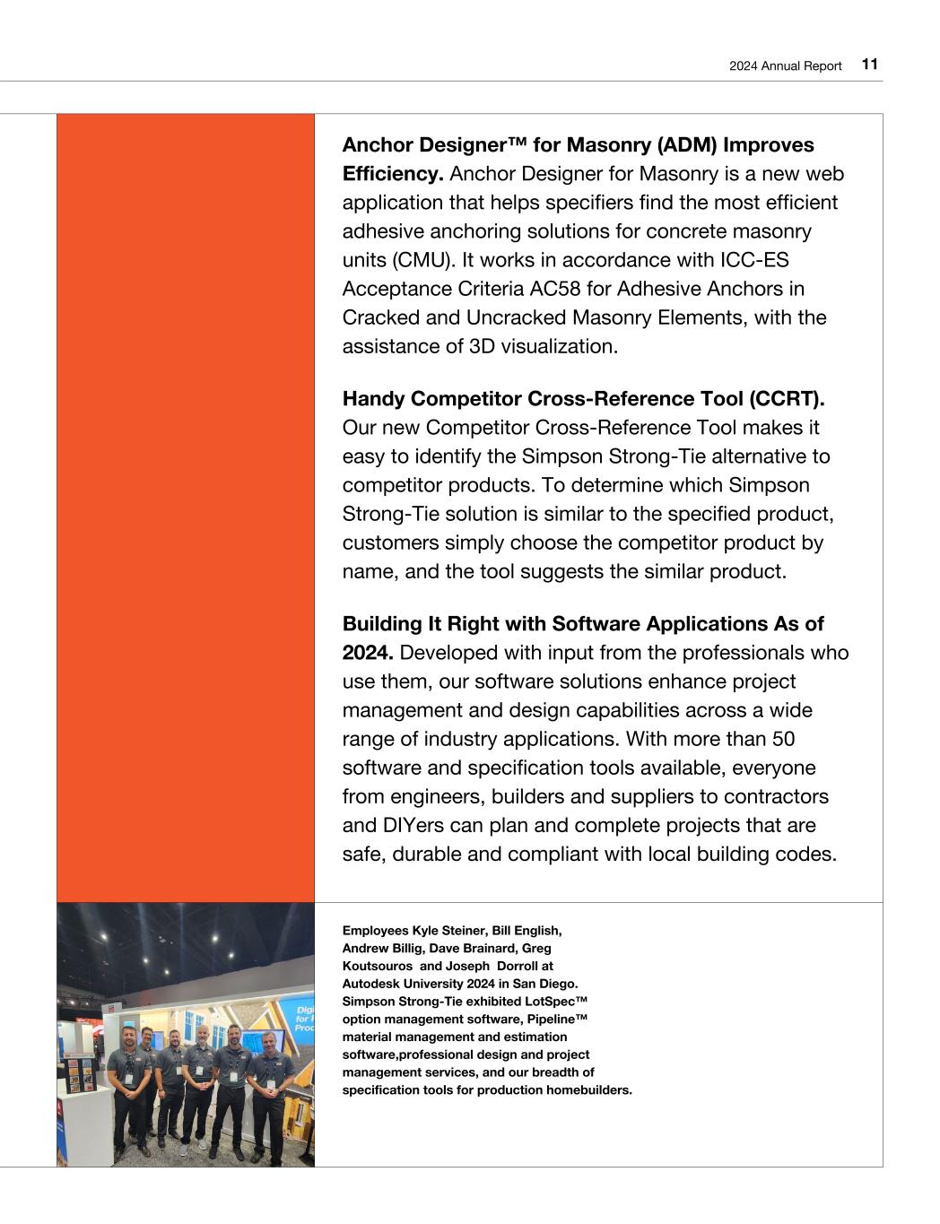 Anchor Designer™ for Masonry (ADM) Improves Efficiency. Anchor Designer for Masonry is a new web application that helps specifiers find the most efficient adhesive anchoring solutions for concrete masonry units (CMU). It works in accordance with ICC-ES Acceptance Criteria AC58 for Adhesive Anchors in Cracked and Uncracked Masonry Elements, with the assistance of 3D visualization. Handy Competitor Cross-Reference Tool (CCRT). Our new Competitor Cross-Reference Tool makes it easy to identify the Simpson Strong-Tie alternative to competitor products. To determine which Simpson Strong-Tie solution is similar to the specified product, customers simply choose the competitor product by name, and the tool suggests the similar product. Building It Right with Software Applications As of 2024. Developed with input from the professionals who use them, our software solutions enhance project management and design capabilities across a wide range of industry applications. With more than 50 software and specification tools available, everyone from engineers, builders and suppliers to contractors and DIYers can plan and complete projects that are safe, durable and compliant with local building codes. Employees Kyle Steiner, Bill English, Andrew Billig, Dave Brainard, Greg Koutsouros and Joseph Dorroll at Autodesk University 2024 in San Diego. Simpson Strong-Tie exhibited LotSpec™ option management software, Pipeline™ material management and estimation software,professional design and project management services, and our breadth of specification tools for production homebuilders. 2024 Annual Report 11