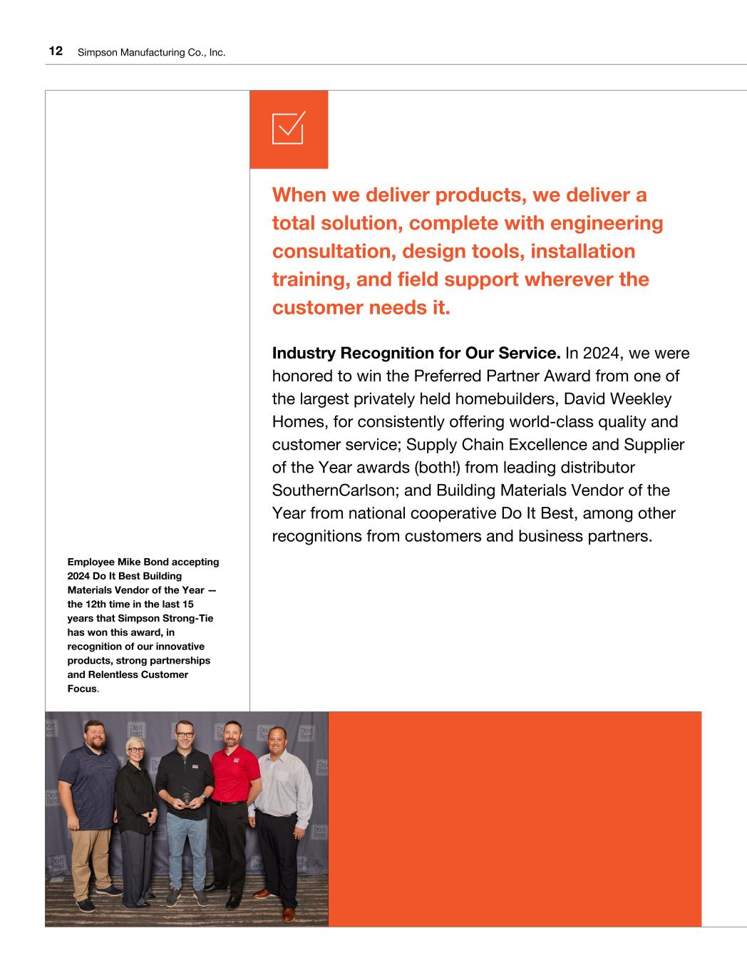 Employee Mike Bond accepting 2024 Do It Best Building Materials Vendor of the Year — the 12th time in the last 15 years that Simpson Strong-Tie has won this award, in recognition of our innovative products, strong partnerships and Relentless Customer Focus. When we deliver products, we deliver a total solution, complete with engineering consultation, design tools, installation training, and field support wherever the customer needs it. Industry Recognition for Our Service. In 2024, we were honored to win the Preferred Partner Award from one of the largest privately held homebuilders, David Weekley Homes, for consistently offering world-class quality and customer service; Supply Chain Excellence and Supplier of the Year awards (both!) from leading distributor SouthernCarlson; and Building Materials Vendor of the Year from national cooperative Do It Best, among other recognitions from customers and business partners. 12 Simpson Manufacturing Co., Inc.