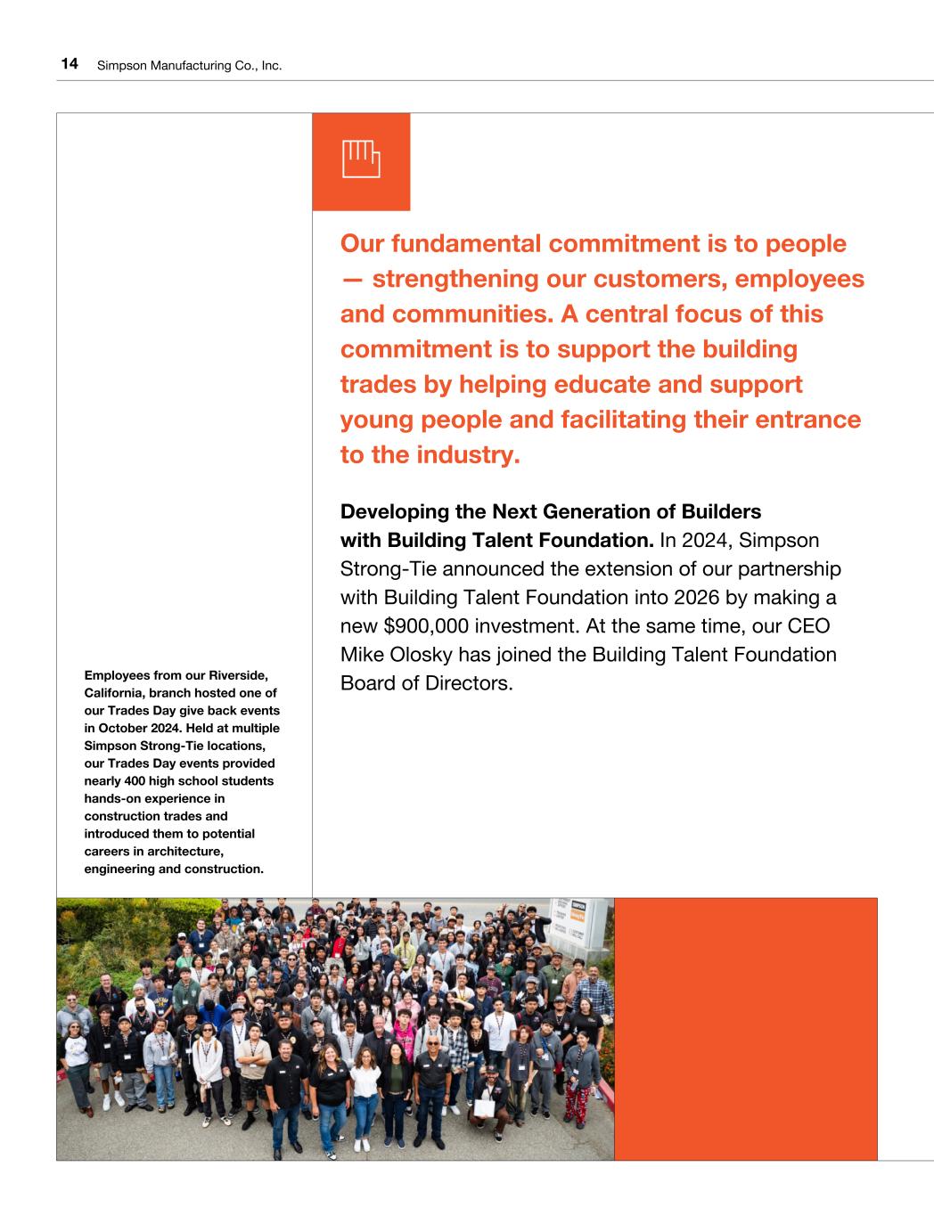 Employees from our Riverside, California, branch hosted one of our Trades Day give back events in October 2024. Held at multiple Simpson Strong-Tie locations, our Trades Day events provided nearly 400 high school students hands-on experience in construction trades and introduced them to potential careers in architecture, engineering and construction. Our fundamental commitment is to people — strengthening our customers, employees and communities. A central focus of this commitment is to support the building trades by helping educate and support young people and facilitating their entrance to the industry. Developing the Next Generation of Builders with Building Talent Foundation. In 2024, Simpson Strong-Tie announced the extension of our partnership with Building Talent Foundation into 2026 by making a new $900,000 investment. At the same time, our CEO Mike Olosky has joined the Building Talent Foundation Board of Directors. 14 Simpson Manufacturing Co., Inc.