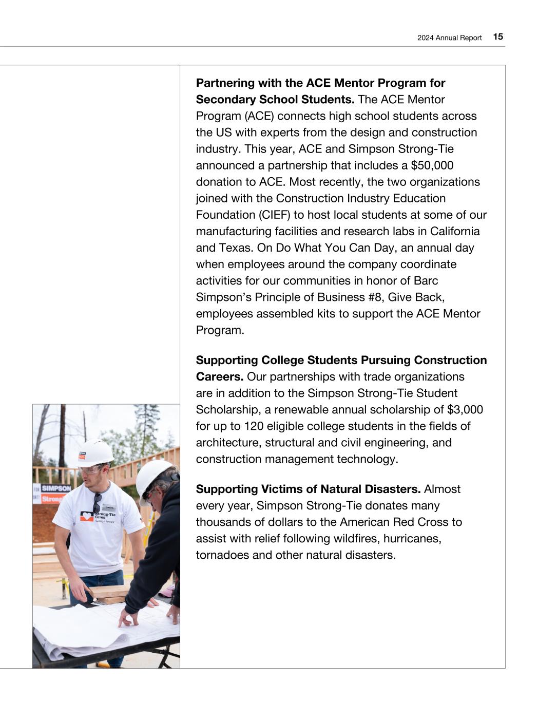 Partnering with the ACE Mentor Program for Secondary School Students. The ACE Mentor Program (ACE) connects high school students across the US with experts from the design and construction industry. This year, ACE and Simpson Strong-Tie announced a partnership that includes a $50,000 donation to ACE. Most recently, the two organizations joined with the Construction Industry Education Foundation (CIEF) to host local students at some of our manufacturing facilities and research labs in California and Texas. On Do What You Can Day, an annual day when employees around the company coordinate activities for our communities in honor of Barc Simpson’s Principle of Business #8, Give Back, employees assembled kits to support the ACE Mentor Program. Supporting College Students Pursuing Construction Careers. Our partnerships with trade organizations are in addition to the Simpson Strong-Tie Student Scholarship, a renewable annual scholarship of $3,000 for up to 120 eligible college students in the fields of architecture, structural and civil engineering, and construction management technology. Supporting Victims of Natural Disasters. Almost every year, Simpson Strong-Tie donates many thousands of dollars to the American Red Cross to assist with relief following wildfires, hurricanes, tornadoes and other natural disasters. 2024 Annual Report 15