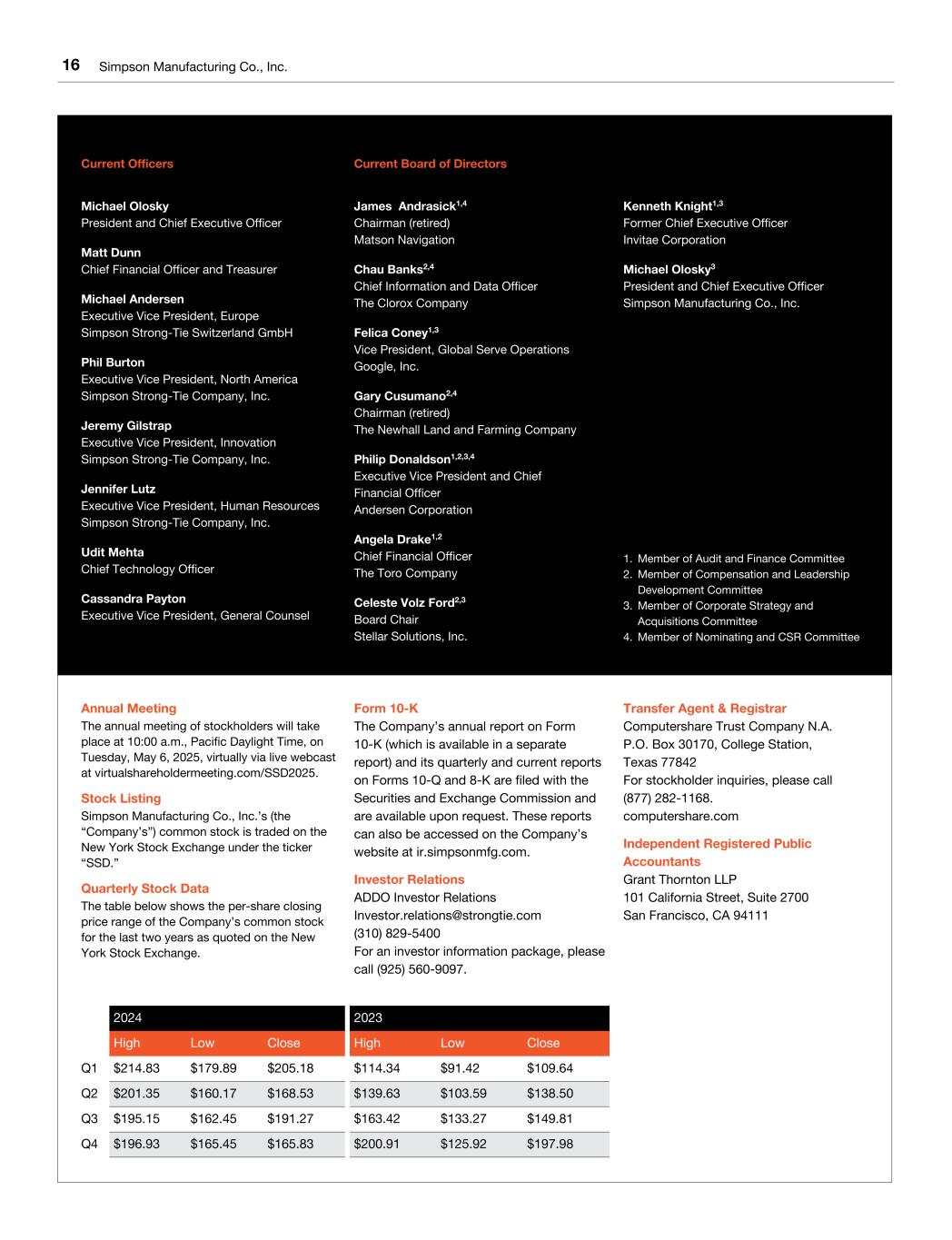 Current Officers Michael Olosky President and Chief Executive Officer Matt Dunn Chief Financial Officer and Treasurer Michael Andersen Executive Vice President, Europe Simpson Strong-Tie Switzerland GmbH Phil Burton Executive Vice President, North America Simpson Strong-Tie Company, Inc. Jeremy Gilstrap Executive Vice President, Innovation Simpson Strong-Tie Company, Inc. Jennifer Lutz Executive Vice President, Human Resources Simpson Strong-Tie Company, Inc. Udit Mehta Chief Technology Officer Cassandra Payton Executive Vice President, General Counsel Current Board of Directors James Andrasick1,4 Chairman (retired) Matson Navigation Chau Banks2,4 Chief Information and Data Officer The Clorox Company Felica Coney1,3 Vice President, Global Serve Operations Google, Inc. Gary Cusumano2,4 Chairman (retired) The Newhall Land and Farming Company Philip Donaldson1,2,3,4 Executive Vice President and Chief Financial Officer Andersen Corporation Angela Drake1,2 Chief Financial Officer The Toro Company Celeste Volz Ford2,3 Board Chair Stellar Solutions, Inc. Kenneth Knight1,3 Former Chief Executive Officer Invitae Corporation Michael Olosky3 President and Chief Executive Officer Simpson Manufacturing Co., Inc. 1. Member of Audit and Finance Committee 2. Member of Compensation and Leadership Development Committee 3. Member of Corporate Strategy and Acquisitions Committee 4. Member of Nominating and CSR Committee Annual Meeting The annual meeting of stockholders will take place at 10:00 a.m., Pacific Daylight Time, on Tuesday, May 6, 2025, virtually via live webcast at virtualshareholdermeeting.com/SSD2025. Stock Listing Simpson Manufacturing Co., Inc.’s (the “Company’s”) common stock is traded on the New York Stock Exchange under the ticker “SSD.” Quarterly Stock Data The table below shows the per-share closing price range of the Company’s common stock for the last two years as quoted on the New York Stock Exchange. Form 10-K The Company’s annual report on Form 10-K (which is available in a separate report) and its quarterly and current reports on Forms 10-Q and 8-K are filed with the Securities and Exchange Commission and are available upon request. These reports can also be accessed on the Company’s website at ir.simpsonmfg.com. Investor Relations ADDO Investor Relations Investor.relations@strongtie.com (310) 829-5400 For an investor information package, please call (925) 560-9097. Transfer Agent & Registrar Computershare Trust Company N.A. P.O. Box 30170, College Station, Texas 77842 For stockholder inquiries, please call (877) 282-1168. computershare.com Independent Registered Public Accountants Grant Thornton LLP 101 California Street, Suite 2700 San Francisco, CA 94111 2024 2023 High Low Close High Low Close Q1 $214.83 $179.89 $205.18 $114.34 $91.42 $109.64 Q2 $201.35 $160.17 $168.53 $139.63 $103.59 $138.50 Q3 $195.15 $162.45 $191.27 $163.42 $133.27 $149.81 Q4 $196.93 $165.45 $165.83 $200.91 $125.92 $197.98 16 Simpson Manufacturing Co., Inc.