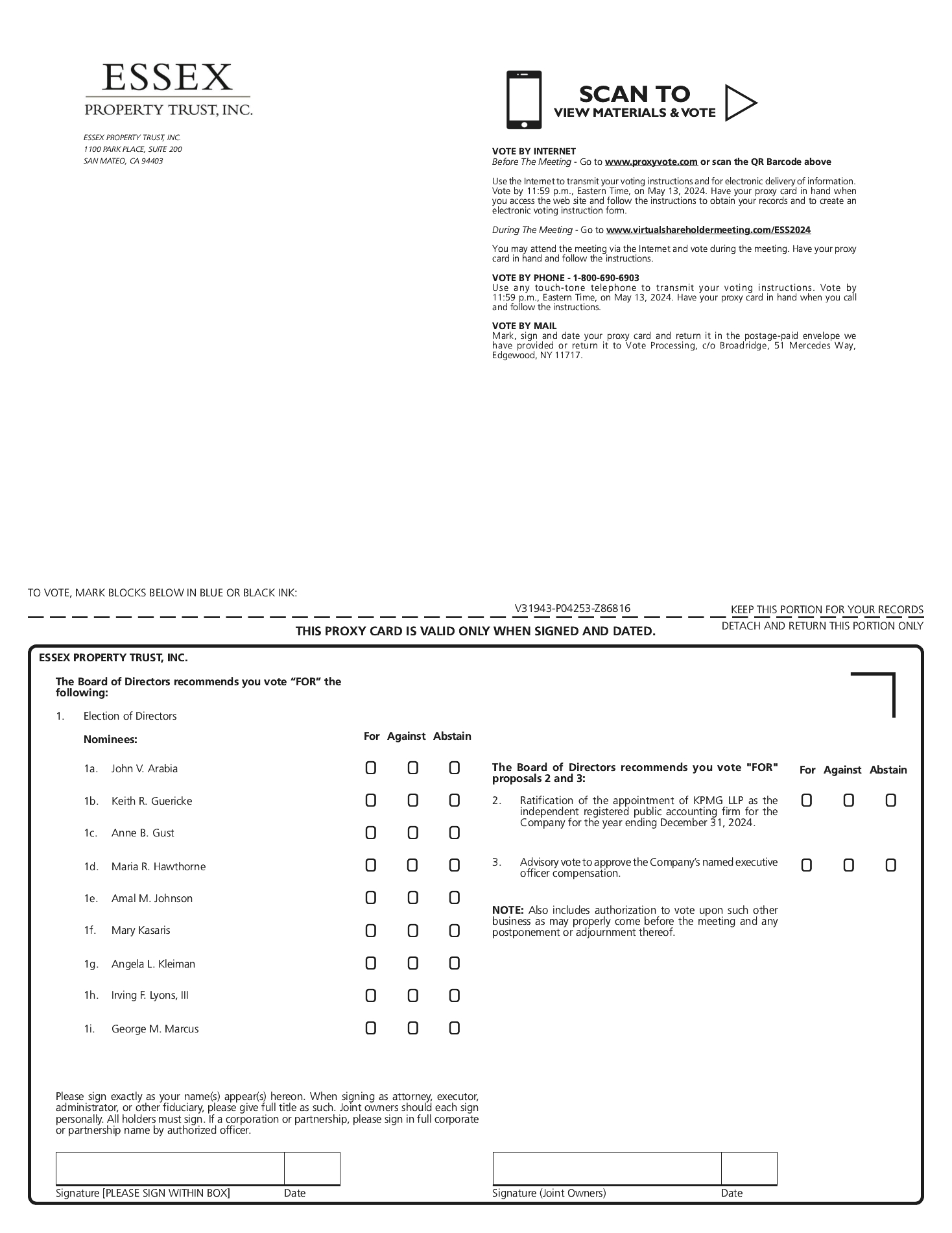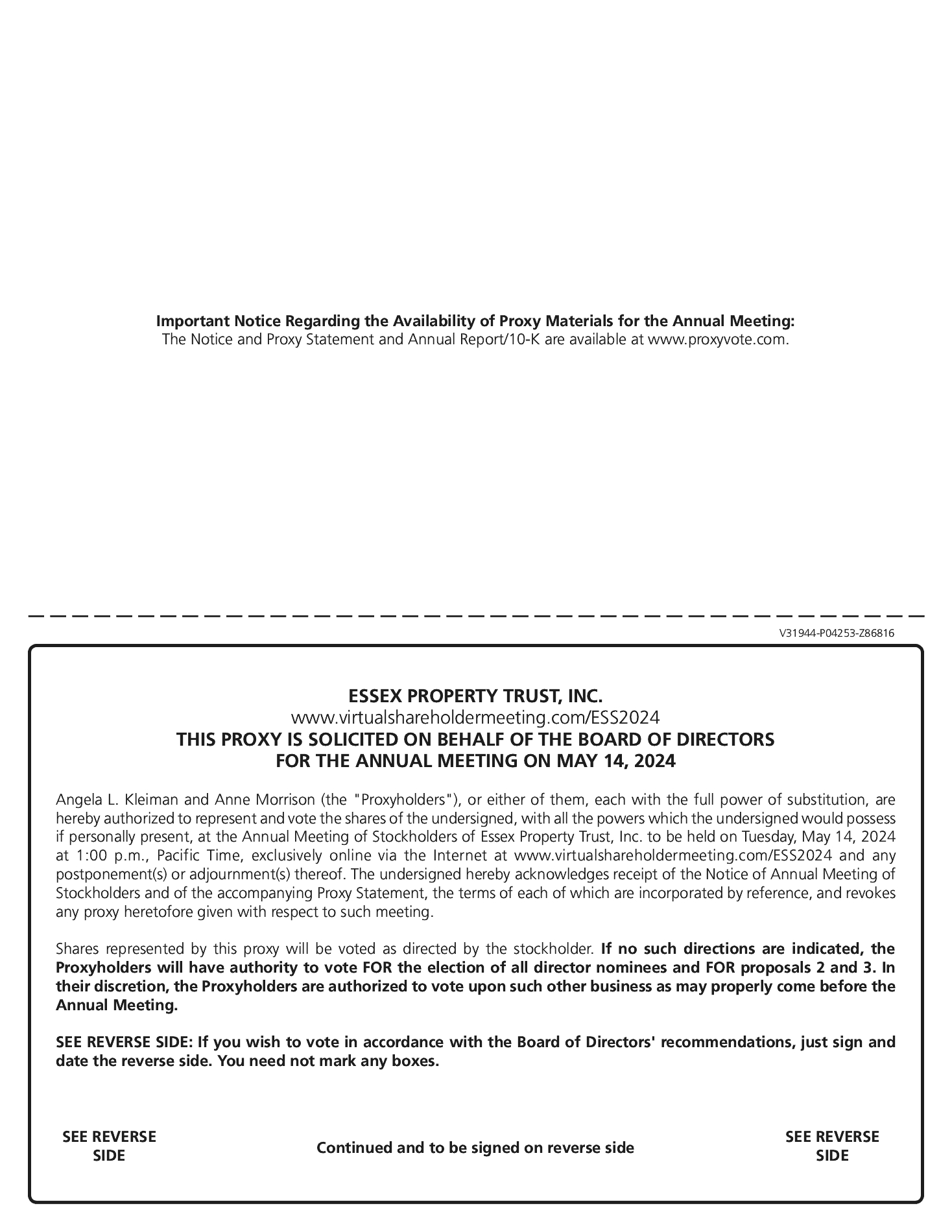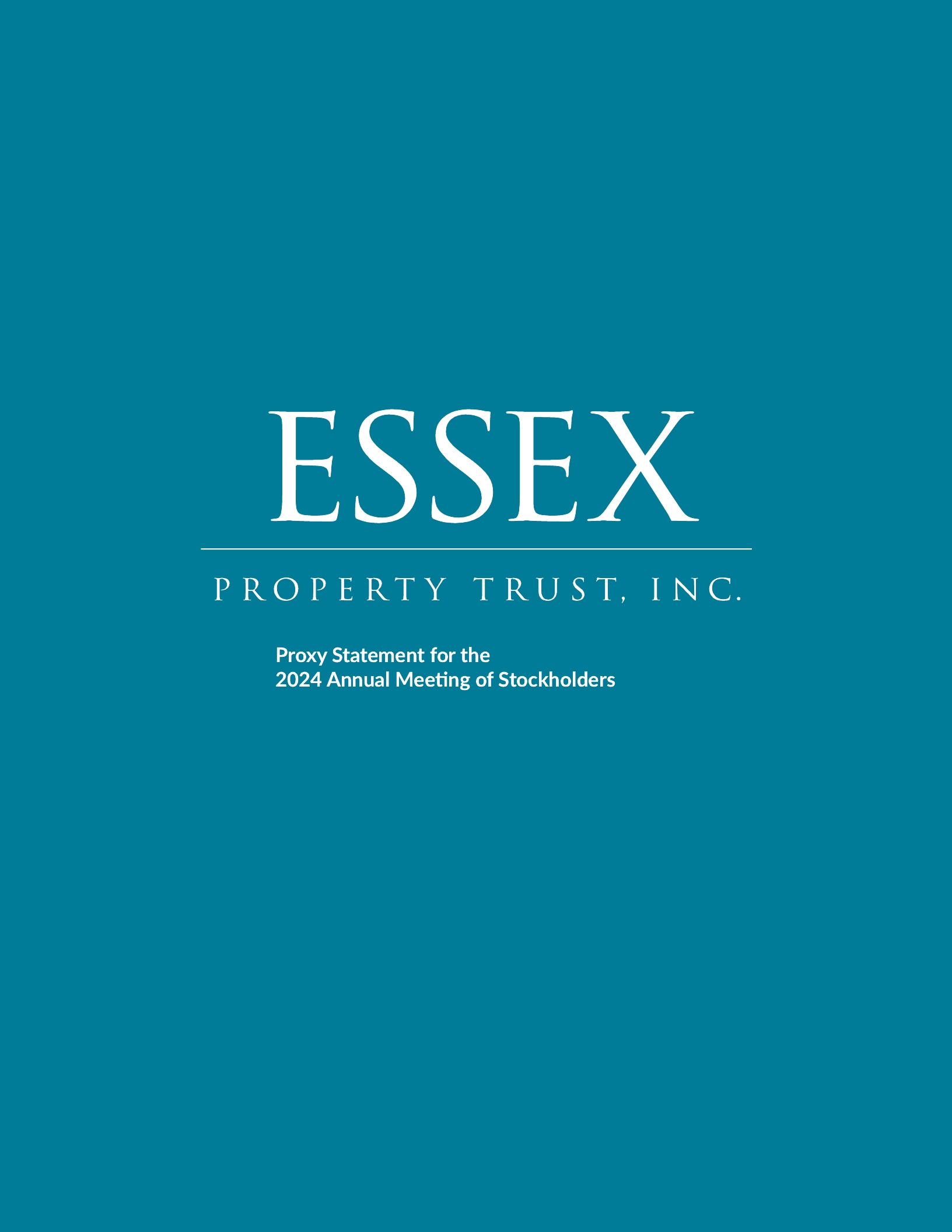 This proxy statement is furnished to the holders of the outstanding shares of common stock, par value $.0001 per share (the “Common Stock”), of Essex Property Trust, Inc., a Maryland corporation (the “Company” or “Essex”), in connection with the solicitation by the Company’s Board of Directors (the “Board”) of proxies in the accompanying form for exercise at the virtual 2024 Annual Meeting to be held online on May 14, 2024 at 1:00 p.m., Pacific Time, at www.virtualshareholdermeeting.com/ESS2024, and any postponement or adjournment thereof.