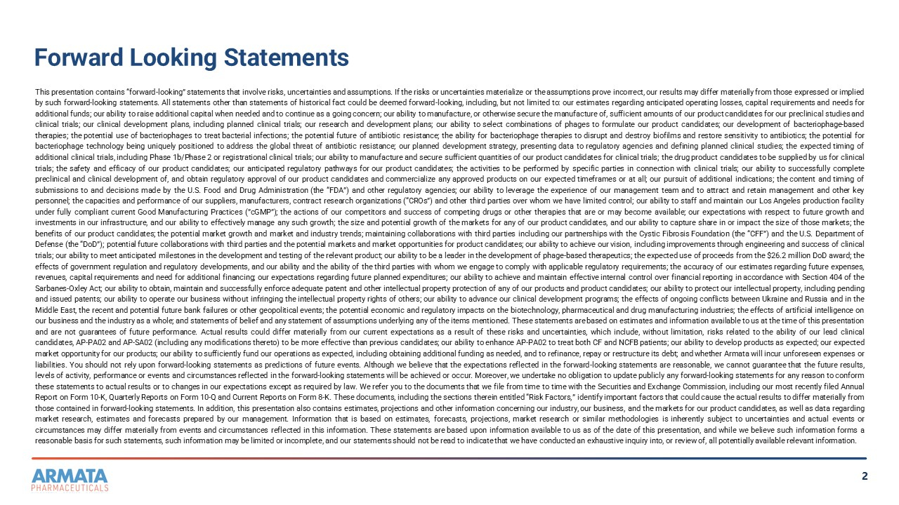 2 This presentation contains “forward - looking” statements that involve risks, uncertainties and assumptions . If the risks or uncertainties materialize or the assumptions prove incorrect, our results may differ materially from those expressed or implied by such forward - looking statements . All statements other than statements of historical fact could be deemed forward - looking, including, but not limited to : our estimates regarding anticipated operating losses, capital requirements and needs for additional funds ; our ability to raise additional capital when needed and to continue as a going concern ; our ability to manufacture, or otherwise secure the manufacture of, sufficient amounts of our product candidates for our preclinical studies and clinical trials ; our clinical development plans, including planned clinical trials ; our research and development plans ; our ability to select combinations of phages to formulate our product candidates ; our development of bacteriophage - based therapies ; the potential use of bacteriophages to treat bacterial infections ; the potential future of antibiotic resistance ; the ability for bacteriophage therapies to disrupt and destroy biofilms and restore sensitivity to antibiotics ; the potential for bacteriophage technology being uniquely positioned to address the global threat of antibiotic resistance ; our planned development strategy, presenting data to regulatory agencies and defining planned clinical studies ; the expected timing of additional clinical trials, including Phase 1 b/Phase 2 or registrational clinical trials ; our ability to manufacture and secure sufficient quantities of our product candidates for clinical trials ; the drug product candidates to be supplied by us for clinical trials ; the safety and efficacy of our product candidates ; our anticipated regulatory pathways for our product candidates ; the activities to be performed by specific parties in connection with clinical trials ; our ability to successfully complete preclinical and clinical development of, and obtain regulatory approval of our product candidates and commercialize any approved products on our expected timeframes or at all ; our pursuit of additional indications ; the content and timing of submissions to and decisions made by the U . S . Food and Drug Administration (the “FDA”) and other regulatory agencies ; our ability to leverage the experience of our management team and to attract and retain management and other key personnel ; the capacities and performance of our suppliers, manufacturers, contract research organizations (“CROs”) and other third parties over whom we have limited control ; our ability to staff and maintain our Los Angeles production facility under fully compliant current Good Manufacturing Practices (”cGMP”) ; the actions of our competitors and success of competing drugs or other therapies that are or may become available ; our expectations with respect to future growth and investments in our infrastructure, and our ability to effectively manage any such growth ; the size and potential growth of the markets for any of our product candidates, and our ability to capture share in or impact the size of those markets ; the benefits of our product candidates ; the potential market growth and market and industry trends ; maintaining collaborations with third parties including our partnerships with the Cystic Fibrosis Foundation (the “CFF”) and the U . S . Department of Defense (the “DoD”) ; potential future collaborations with third parties and the potential markets and market opportunities for product candidates ; our ability to achieve our vision, including improvements through engineering and success of clinical trials ; our ability to meet anticipated milestones in the development and testing of the relevant product ; our ability to be a leader in the development of phage - based therapeutics ; the expected use of proceeds from the $ 26 . 2 million DoD award ; the effects of government regulation and regulatory developments, and our ability and the ability of the third parties with whom we engage to comply with applicable regulatory requirements ; the accuracy of our estimates regarding future expenses, revenues, capital requirements and need for additional financing ; our expectations regarding future planned expenditures ; our ability to achieve and maintain effective internal control over financial reporting in accordance with Section 404 of the Sarbanes - Oxley Act ; our ability to obtain, maintain and successfully enforce adequate patent and other intellectual property protection of any of our products and product candidates ; our ability to protect our intellectual property, including pending and issued patents ; our ability to operate our business without infringing the intellectual property rights of others ; our ability to advance our clinical development programs ; the effects of ongoing conflicts between Ukraine and Russia and in the Middle East, the recent and potential future bank failures or other geopolitical events ; the potential economic and regulatory impacts on the biotechnology, pharmaceutical and drug manufacturing industries ; the effects of artificial intelligence on our business and the industry as a whole ; and statements of belief and any statement of assumptions underlying any of the items mentioned . These statements are based on estimates and information available to us at the time of this presentation and are not guarantees of future performance . Actual results could differ materially from our current expectations as a result of these risks and uncertainties, which include, without limitation, risks related to the ability of our lead clinical candidates, AP - PA 02 and AP - SA 02 (including any modifications thereto) to be more effective than previous candidates ; our ability to enhance AP - PA 02 to treat both CF and NCFB patients ; our ability to develop products as expected ; 