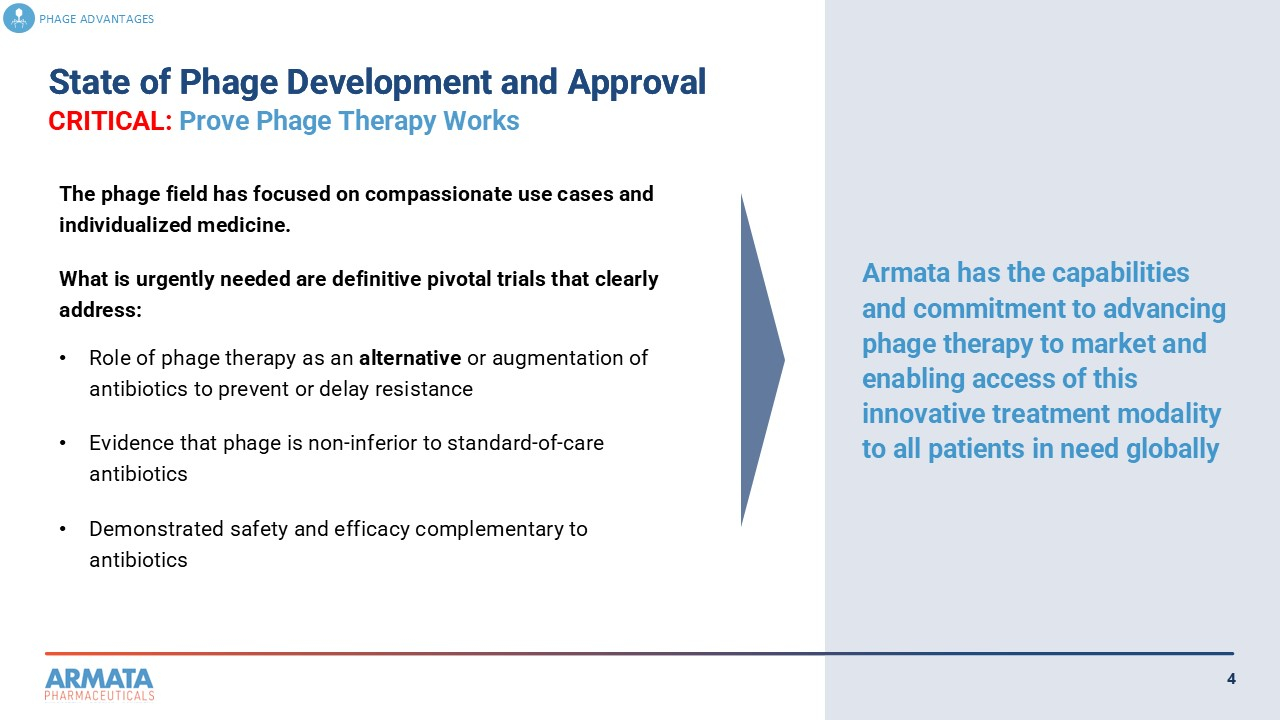 3 Phages Are a Novel Biologic Anti - Infective with Distinct MOA from Antibiotics and Significant Advantages for the Fight Against AMR PHAGE ADVANTAGES How Phages Kill Bacteria Novel therapeutic approach addresses increasing antibiotic - induced microbial resistance Phage activity independent of antibiotic resistance, including MDR infections Reduced antibiotic use slows broader resistance development Agile development approach Potential for product modifications as clinical isolate landscape evolves, both during development and after launch Potential monotherapy or in combination antibiotics As alternative to, or synergistic to, current SOC Safety benefits and long - term historical data Species - specific, front - line therapy eliminates microbiome disruption that occurs with traditional antibiotics Decades of published data for therapeutic use in Eastern Europe AMR: Antimicrobial resistance; SOC: Standard of care Key Advantages of Phage Therapy