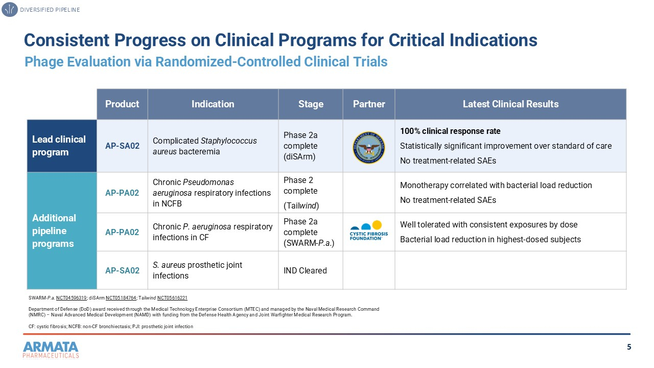 4 State of Phage Development and Approval PHAGE ADVANTAGES The phage field has focused on compassionate use cases and individualized medicine. What is urgently needed are definitive pivotal trials that clearly address: • Role of phage therapy as an alternative or augmentation of antibiotics to prevent or delay resistance • Evidence that phage is non - inferior to standard - of - care antibiotics • Demonstrated safety and efficacy complementary to antibiotics Armata has the capabilities and commitment to advancing phage therapy to market and enabling access of this innovative treatment modality to all patients in need globally 4 State of Phage Development and Approval CRITICAL: Prove Phage Therapy Works