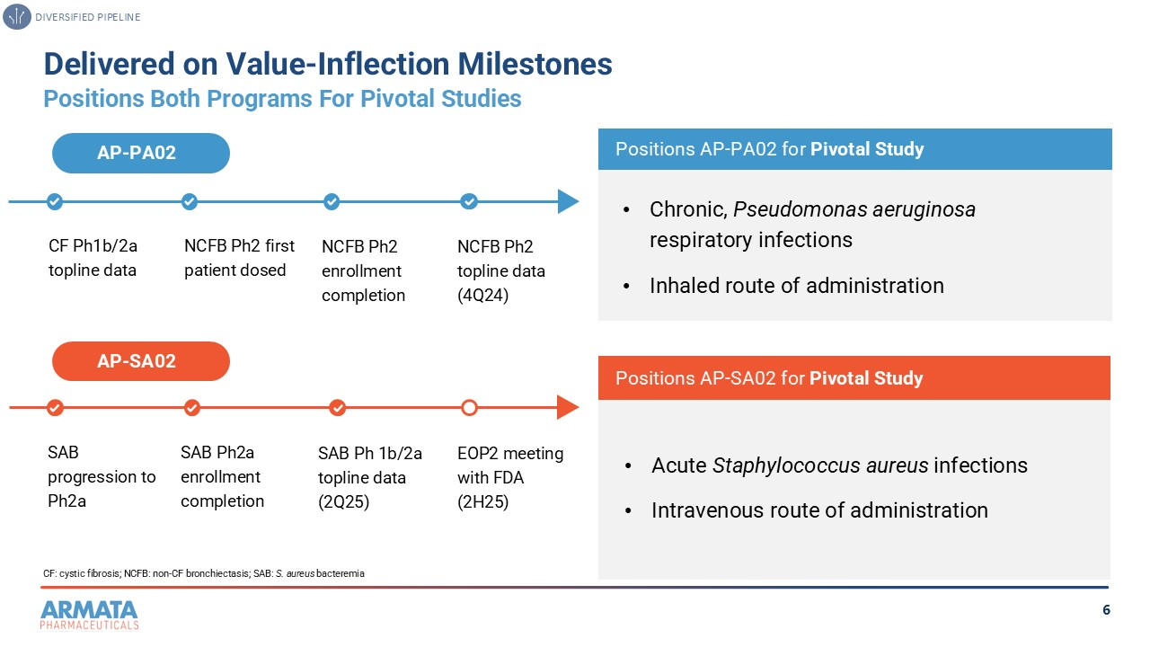 5 Consistent Progress on Clinical Programs for Critical Indications Phage Evaluation via Randomized - Controlled Clinical Trials SWARM - P.a. NCT04596319 ; diSArm NCT05184764 ; Tail wind NCT05616221 Department of Defense (DoD) award received through the Medical Technology Enterprise Consortium (MTEC) and managed by the Nav al Medical Research Command (NMRC) – Naval Advanced Medical Development (NAMD) with funding from the Defense Health Agency and Joint Warfighter Medical Rese arch Program. CF: cystic fibrosis; NCFB: non - CF bronchiectasis; PJI: prosthetic joint infection DIVERSIFIED PIPELINE Latest Clinical Results Partner Stage Indication Product 100% clinical response rate Statistically significant improvement over standard of care No treatment - related SAEs Phase 2a complete ( diSArm ) Complicated Staphylococcus aureus bacteremia AP - SA02 Lead clinical program Monotherapy correlated with bacterial load reduction No treatment - related SAEs Phase 2 complete (Tail wind ) Chronic Pseudomonas aeruginosa respiratory infections in NCFB AP - PA02 Additional pipeline programs Well tolerated with consistent exposures by dose Bacterial load reduction in highest - dosed subjects Phase 2a complete (SWARM - P.a. ) Chronic P. aeruginosa respiratory infections in CF AP - PA02 IND Cleared S. aureus prosthetic joint infections AP - SA02