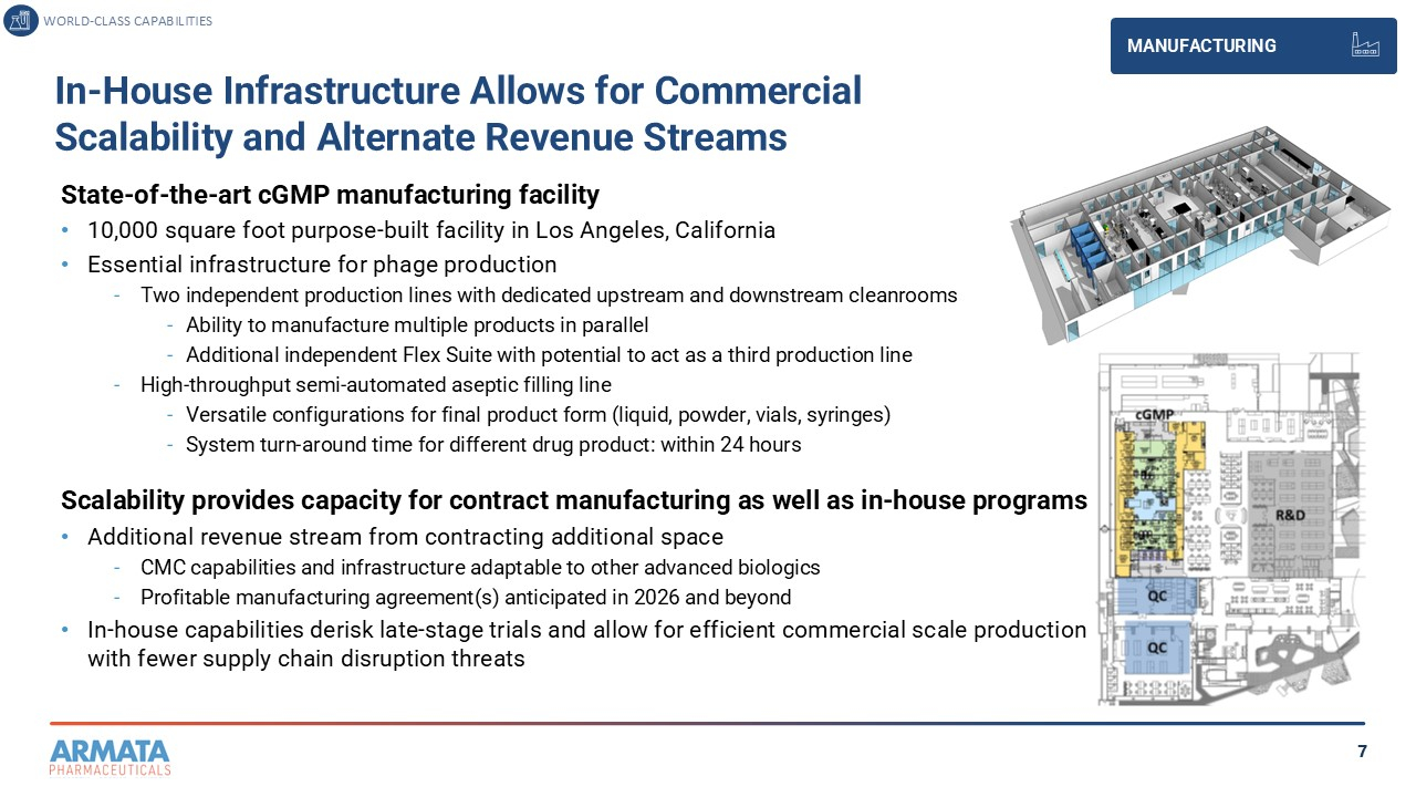 7 In - House Infrastructure Allows for Commercial Scalability and Alternate Revenue Streams State - of - the - art cGMP manufacturing facility • 10,000 square foot purpose - built facility in Los Angeles, California • Essential infrastructure for phage production - Two independent production lines with dedicated upstream and downstream cleanrooms - Ability to manufacture multiple products in parallel - Additional independent Flex Suite with potential to act as a third production line - High - throughput semi - automated aseptic filling line - Versatile configurations for final product form (liquid, powder, vials, syringes) - System turn - around time for different drug product: within 24 hours Scalability provides capacity for contract manufacturing as well as in - house programs • Additional revenue stream from contracting additional space - CMC capabilities and infrastructure adaptable to other advanced biologics - Profitable manufacturing agreement(s) anticipated in 2026 and beyond • In - house capabilities derisk late - stage trials and allow for efficient commercial scale production with fewer supply chain disruption threats WORLD - CLASS CAPABILITIES MANUFACTURING