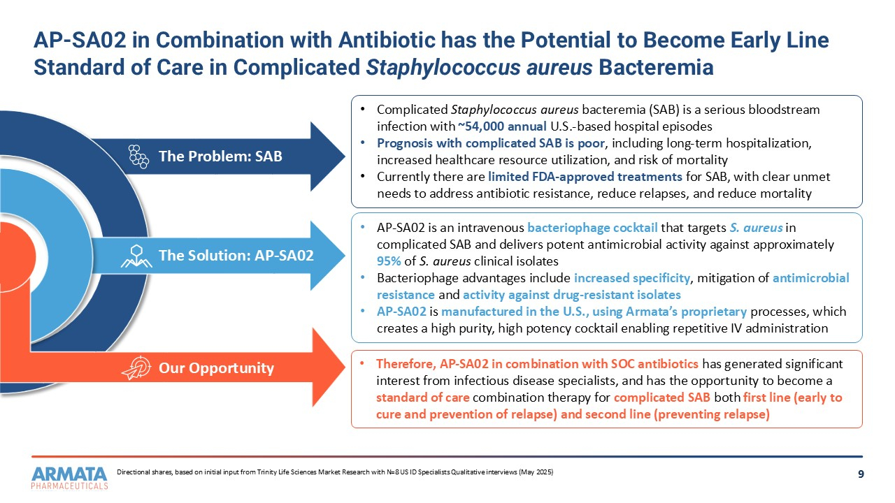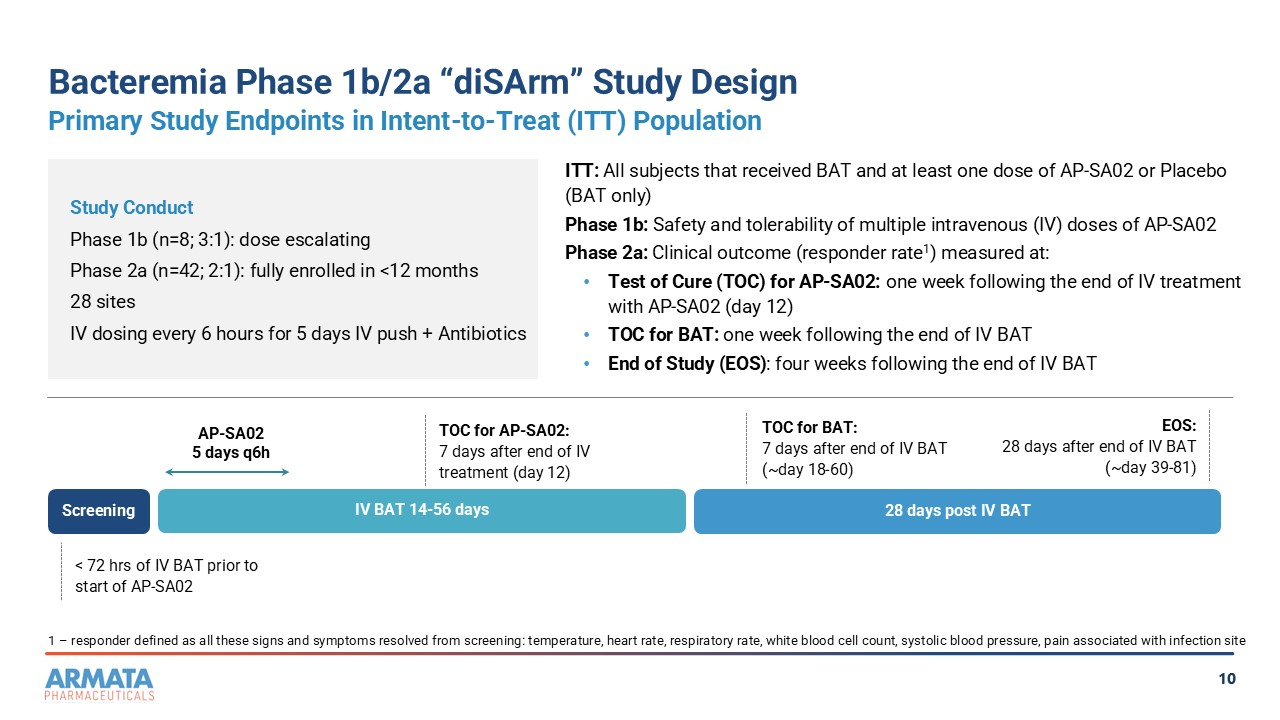 9 • Complicated Staphylococcus aureus bacteremia (SAB) is a serious bloodstream infection with ~54,000 annual U.S. - based hospital episodes • Prognosis with complicated SAB is poor , including long - term hospitalization, increased healthcare resource utilization, and risk of mortality • Currently there are limited FDA - approved treatments for SAB, with clear unmet needs to address antibiotic resistance, reduce relapses, and reduce mortality Our Opportunity The Problem: SAB The Solution: AP - SA02 • AP - SA02 is an intravenous bacteriophage cocktail that targets S. aureus in complicated SAB and delivers potent antimicrobial activity against approximately 95% of S. aureus clinical isolates • Bacteriophage advantages include increased specificity , mitigation of antimicrobial resistance and activity against drug - resistant isolates • AP - SA02 is manufactured in the U.S., using Armata’s proprietary processes, which creates a high purity, high potency cocktail enabling repetitive IV administration • Therefore, AP - SA02 in combination with SOC antibiotics has generated significant interest from infectious disease specialists, and has the opportunity to become a standard of care combination therapy for complicated SAB both first line (early to cure and prevention of relapse) and second line (preventing relapse) AP - SA02 in Combination with Antibiotic has the Potential to Become Early Line Standard of Care i n Complicated Staphylococcus aureus Bacteremia Directional shares, based on initial input from Trinity Life Sciences Market Research with N=8 US ID Specialists Qualitative int erviews (May 2025)