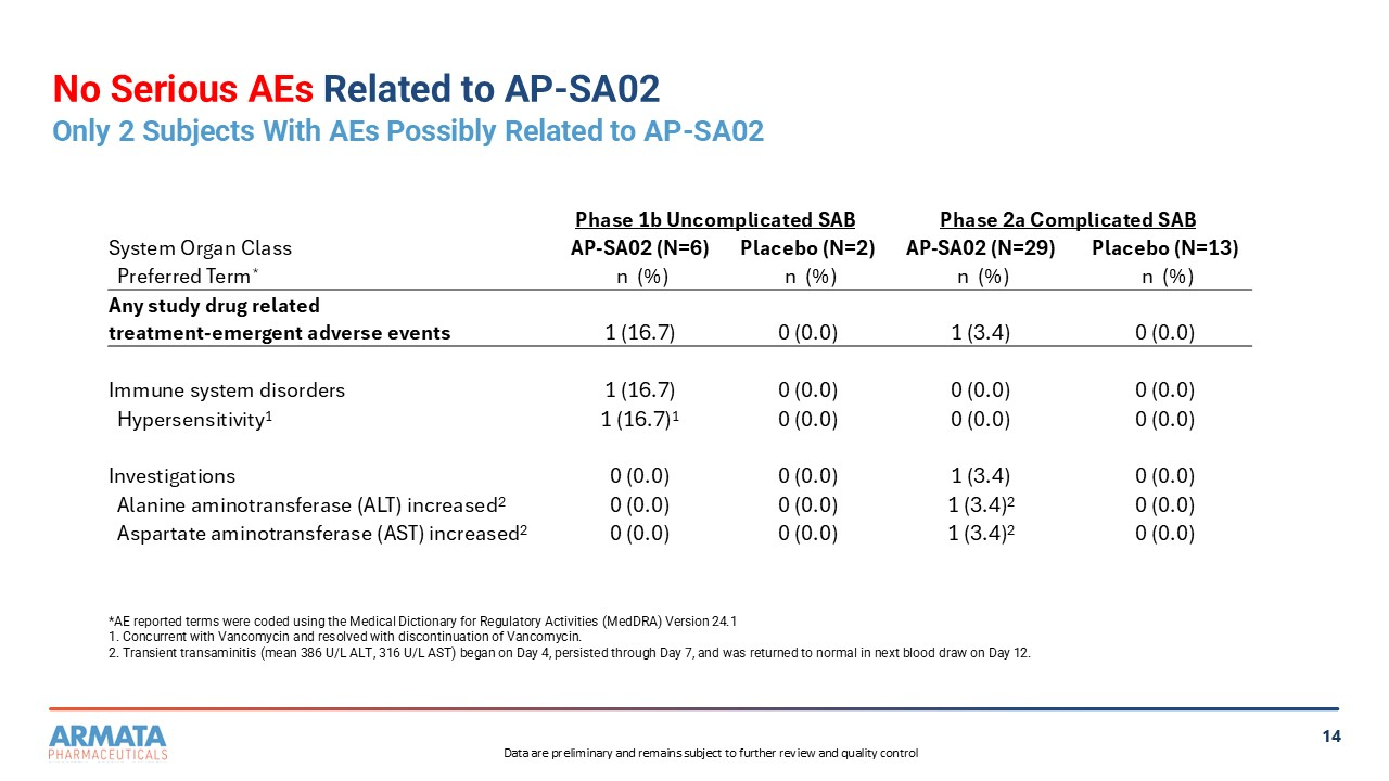13 Phase 2a Complicated SAB Phase 1b Uncomplicated SAB Placebo (N=13) AP - SA02 (N=29) Placebo (N=2) AP - SA02 (N=6) n (%) n (%) n (%) n (%) 12 (92.3) 19 (65.5) 2 (100.0) 6 (100.0) Any adverse events (AEs) 10 (76.9) 17 (58.6) 2 (100.0) 6 (100.0) Any treatment - emergent AEs (TEAEs) 1 0 (0.0) 1 (3.4) 0 (0.0) 1 (16.7) Any study drug related TEAEs 2 3 (23.1) 4 (13.8) 0 (0.0) 3 (50.0) Any Best Available Therapy related TEAEs 3 (23.1) 4 (13.8) 1 (50.0) 5 (83.3) Any serious AEs (SAEs) 9 (69.2) 9 (31.0) 1 (50.0) 5 (83.3) NCI CTCAE Grade 3/4/5 Aes 7 (53.8) 8 (27.6) 1 (50.0) 5 (83.3) NCI CTCAE Grade 3/4/5 TEAEs 0 (0.0) 0 (0.0) 0 (0.0) 1 (16.7) Any TEAEs leading to interruption of study drug 1 (7.7) 0 (0.0) 0 (0.0) 0 (0.0) Any TEAEs leading to withdrawal of study drug 0 (0.0) 1 (3.4) 0 (0.0) 0 (0.0) Any TEAEs leading to discontinuation of study 0 (0.0) 1 (3.4) 3 0 (0.0) 0 (0.0) Any AEs leading to death 3 AP - SA02 Administered IV Every 6 Hours for 5 Days is Well Tolerated Safety Population (N=50) Data are preliminary and remains subject to further review and quality control 1. TEAEs are defined as adverse events (AEs) occurring after the first dose of AP - SA02 through TOC (Day 12) or through EOS for S AEs. 2. Refer to next slide. 3. Subject was blood culture negative for S. aureus by Day 3/5 of AP - SA02 treatment (8 days before death); fatal (unrelated) eve nt of multiple organ failure determined by study PI to be unrelated to both study drug and vancomycin. NCI CTCAE = National Cancer Institute Common Terminology Criteria for Adverse Events.