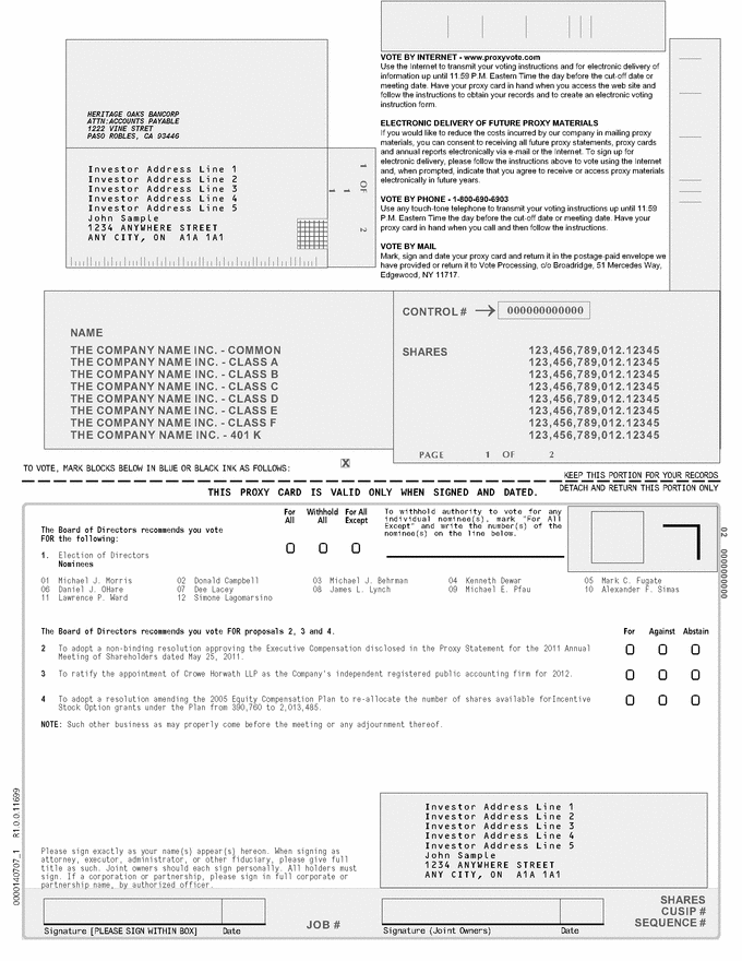 1 1 12345678 12345678 12345678 12345678 12345678 12345678 12345678 12345678 000000000000 NAME THE COMPANY NAME INC. - COMMON 123,456,789,012.12345 THE COMPANY NAME INC. - CLASS A 123,456,789,012.12345 THE COMPANY NAME INC. - CLASS B 123,456,789,012.12345 THE COMPANY NAME INC. - CLASS C 123,456,789,012.12345 THE COMPANY NAME INC. - CLASS D 123,456,789,012.12345 THE COMPANY NAME INC. - CLASS E 123,456,789,012.12345 THE COMPANY NAME INC. - CLASS F 123,456,789,012.12345 THE COMPANY NAME INC. - 401 K 123,456,789,012.12345 x 02 0000000000 JOB # 1 OF 2 1 OF 2 PAGE SHARES CUSIP # SEQUENCE # THIS PROXY CARD IS VALID ONLY WHEN SIGNED AND DATED. KEEP THIS PORTION FOR YOUR RECORDS DETACH AND RETURN THIS PORTION ONLY TO VOTE, MARK BLOCKS BELOW IN BLUE OR BLACK INK AS FOLLOWS: Signature (Joint Owners) Signature [PLEASE SIGN WITHIN BOX] Date Date CONTROL # SHARES To withhold authority to vote for any individual nominee(s), mark “For All Except” and write the number(s) of the nominee(s) on the line below. 0 0 0 0 0 0 0 0 0 0 0 0 0000140707_1 R1.0.0.11699 For Withhold For All All All Except The Board of Directors recommends you vote FOR the following: 1. Election of Directors Nominees 01 Michael J. Morris 02 Donald Campbell 03 Michael J. Behrman 04 Kenneth Dewar 05 Mark C. Fugate 06 Daniel J. OHare 07 Dee Lacey 08 James L. Lynch 09 Michael E. Pfau 10 Alexander F. Simas 11 Lawrence P. Ward 12 Simone Lagomarsino HERITAGE OAKS BANCORP ATTN:ACCOUNTS PAYABLE 1222 VINE STRET PASO ROBLES, CA 93446 Investor Address Line 1 Investor Address Line 2 Investor Address Line 3 Investor Address Line 4 Investor Address Line 5 John Sample 1234 ANYWHERE STREET ANY CITY, ON A1A 1A1 Investor Address Line 1 Investor Address Line 2 Investor Address Line 3 Investor Address Line 4 Investor Address Line 5 John Sample 1234 ANYWHERE STREET ANY CITY, ON A1A 1A1 VOTE BY INTERNET - www.proxyvote.com Use the Internet to transmit your voting instructions and for electronic delivery of information up until 11:59 P.M. Eastern Time the day before the cut-off date or meeting date. Have your proxy card in hand when you access the web site and follow the instructions to obtain your records and to create an electronic voting instruction form. ELECTRONIC DELIVERY OF FUTURE PROXY MATERIALS If you would like to reduce the costs incurred by our company in mailing proxy materials, you can consent to receiving all future proxy statements, proxy cards and annual reports electronically via e-mail or the Internet. To sign up for electronic delivery, please follow the instructions above to vote using the Internet and, when prompted, indicate that you agree to receive or access proxy materials electronically in future years. VOTE BY PHONE - 1-800-690-6903 Use any touch-tone telephone to transmit your voting instructions up until 11:59 P.M. Eastern Time the day before the cut-off date or meeting date. Have your proxy card in hand when you call and then follow the instructions. VOTE BY MAIL Mark, sign and date your proxy card and return it in the postage-paid envelope we have provided or return it to Vote Processing, c/o Broadridge, 51 Mercedes Way, Edgewood, NY 11717. The Board of Directors recommends you vote FOR proposals 2, 3 and 4. For Against Abstain 2 To adopt a non-binding resolution approving the Executive Compensation disclosed in the Proxy Statement for the 2011 Annual Meeting of Shareholders dated May 25, 2011. 3 To ratify the appointment of Crowe Horwath LLP as the Company's independent registered public accounting firm for 2012. 4 To adopt a resolution amending the 2005 Equity Compensation Plan to re-allocate the number of shares available forIncentive Stock Option grants under the Plan from 390,760 to 2,013,485. NOTE: Such other business as may properly come before the meeting or any adjournment thereof. Please sign exactly as your name(s) appear(s) hereon. When signing as attorney, executor, administrator, or other fiduciary, please give full title as such. Joint owners should each sign personally. All holders must sign. If a corporation or partnership, please sign in full corporate or partnership name, by authorized officer. |