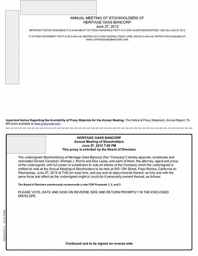 0000140707_2 R1.0.0.11699 ANNUAL MEETING OF STOCKHOLDERS OF HERITAGE OAKS BANCORP June 27, 2012 IMPORTANT NOTICE REGARDING THE AVAILABILITY OF PROXY MATERIALS FOR THE SHAREHOLDER MEETINGTO BE HELD ON JUNE 27, 2012 THE PROXY STATEMENT FOR THE 2012 ANNUAL MEETING OF SHAREHOLDERS, PROXY CARD, AND 2010 ANNUAL REPORT ARE AVAILABLE AT WWW.HERITAGEOAKSBANCORP.COM. Important Notice Regarding the Availability of Proxy Materials for the Annual Meeting: The Notice & Proxy Statement, Annual Report, TI-BR is/are available at www.proxyvote.com . HERITAGE OAKS BANCORP Annual Meeting of Shareholders June 27, 2012 7:00 PM This proxy is solicited by the Board of Directors The undersigned Stockholder(s) of Heritage Oaks Bancorp (the "Company") hereby appoints, constitutes and nominates Donald Campbell, Michael J. Morris and Dee Lacey, and each of them, the attorney, agent and proxy of the undersigned, with full power of substitution to vote all shares of the Company which the undersigned is entitled to vote at the Annual Meeting of Stockholders to be held at 545 12th Street, Paso Robles, California on Wednesday, June 27, 2012 at 7:00 pm local time, and any and all adjournments thereof, as fully and with the same force and effect as the undersigned might or could do if personally present thereat, as follows: The Board of Directors unanimously recommends a vote FOR Proposals 1, 2, and 3. PLEASE VOTE, DATE AND SIGN ON REVERSE SIDE AND RETURN PROMPTLY IN THE ENCLOSED ENVELOPE. Continued and to be signed on reverse side |