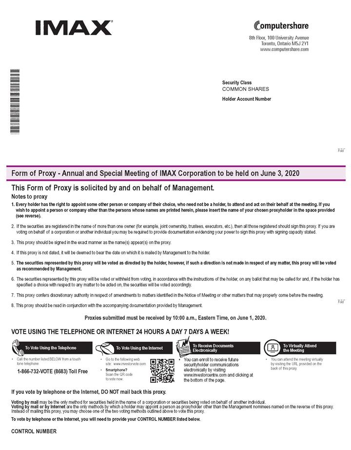 8th Floor, 100 University Avenue Toronto, Ontario M5J 2Y1 www.computershare.com Security Class COMMON SHARES Holder Account Number Fold Form of Proxy Annual and Special Meeting of IMAX Corporation to be held on June 3, 2020 This Form of Proxy is solicited by and on behalf of Management. Fold CONTROL NUMBER Notes to proxy 1. Every holder has the right to appoint some other person or company of their choice, who need not be a holder, to attend and act on their behalf at the meeting. If you wish to appoint a person or company other than the persons whose names are printed herein, please insert the name of your chosen proxyholder in the space provided (see reverse). 2. If the securities are registered in the name of more than one owner (for example, joint ownership, trustees, executors, etc.), then all those registered should sign this proxy. If you are voting on behalf of a corporation or another individual you may be required to provide documentation evidencing your power to sign this proxy with signing capacity stated. 3. This proxy should be signed in the exact manner as the name(s) appear(s) on the proxy. 4. If this proxy is not dated, it will be deemed to bear the date on which it is mailed by Management to the holder. 5. The securities represented by this proxy will be voted as directed by the holder, however, if such a direction is not made in respect of any matter, this proxy will be voted as recommended by Management. 6. The securities represented by this proxy will be voted or withheld from voting, in accordance with the instructions of the holder, on any ballot that may be called for and, if the holder has specified a choice with respect to any matter to be acted on, the securities will be voted accordingly. 7. This proxy confers discretionary authority in respect of amendments to matters identified in the Notice of Meeting or other matters that may properly come before the meeting. 8. This proxy should be read in conjunction with the accompanying documentation provided by Management. Proxies submitted must be received by 10:00 a.m., Eastern Time, on June 1, 2020. VOTE USING THE TELEPHONE OR INTERNET 24 HOURS A DAY 7 DAYS A WEEK To Vote Using the Telephone To Vote Using the Internet To Receive Documents Electronically Call the number listed BELOW from a touch tone telephone. Go to the following web site: www.investorvote.com Smartphone Scan the QR code to vote now. You can enroll to receive future securityholder communications electronically by visiting www.investorcentre.com and clicking at the bottom of the page. To Virtually Attend the Meeting • You can attend the meeting virtually by visiting the URL provided on the back of this proxy 1-866-732-VOTE (8683) Toll Free If you vote by telephone or the Internet, DO NOT mail back this proxy. Voting by mail may be the only method for securities held in the name of a corporation or securities being voted on behalf of another individual. Voting by mail or by Internet are the only methods by which a holder may appoint a person as proxyholder other than the Management nominees named on the reverse of this proxy. Instead of mailing this proxy, you may choose one of the two voting methods outlined above to vote this proxy To vote by telephone or the Internet, you will need to provide your CONTROL NUMBER listed below. CONTROL NUMBER