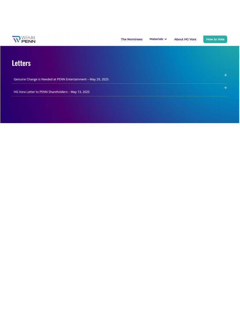 On May 30, 2025, HG Vora Capital Management, LLC and certain of its affiliates, the beneficial owners of approximately 4.80% of the outstanding common stock of PENN Entertainment, Inc. (NASDAQ: PENN), posted the following materials to www.WinAtPENN.com (the “Site”). Copies of the materials posted to the Site are filed herewith.