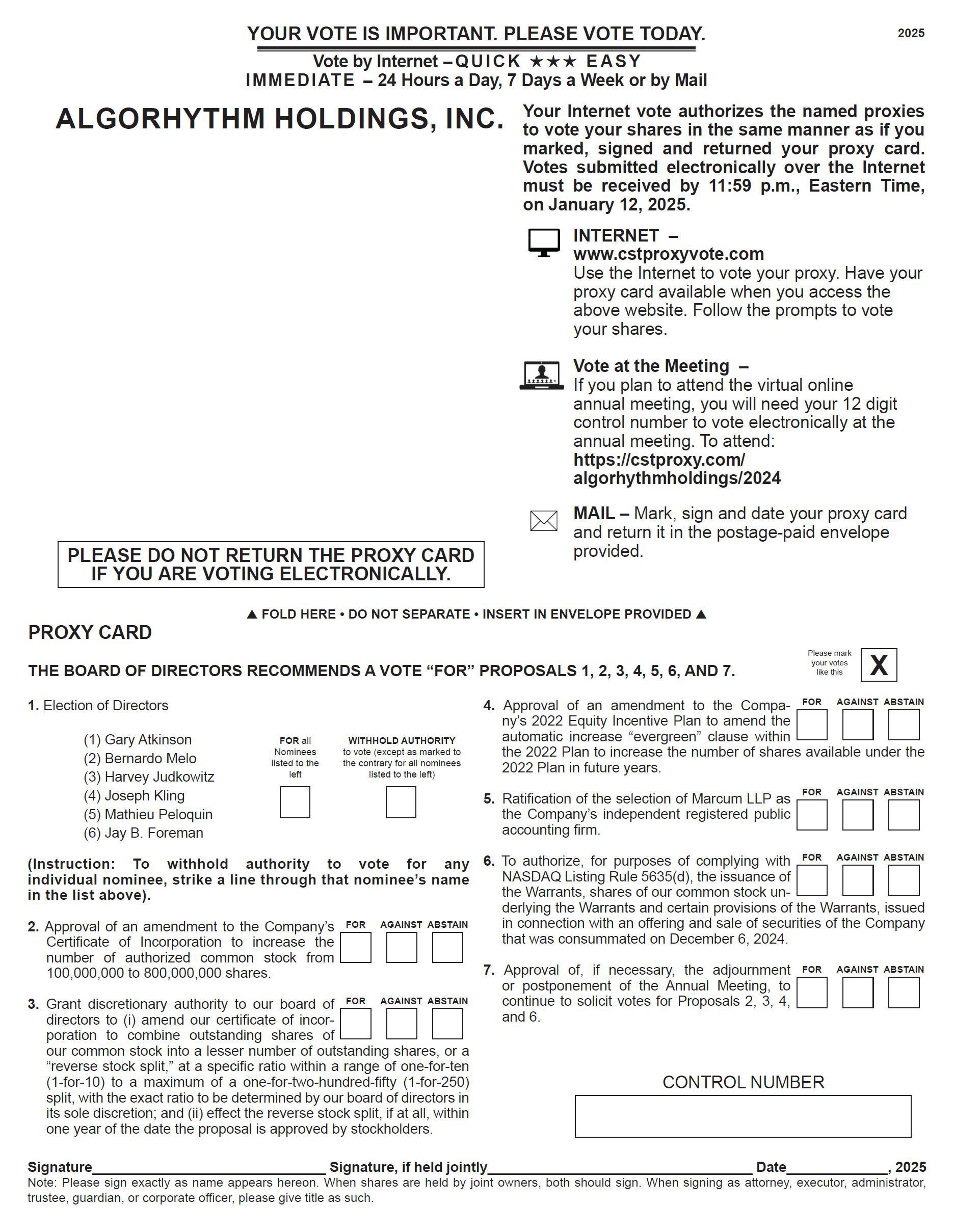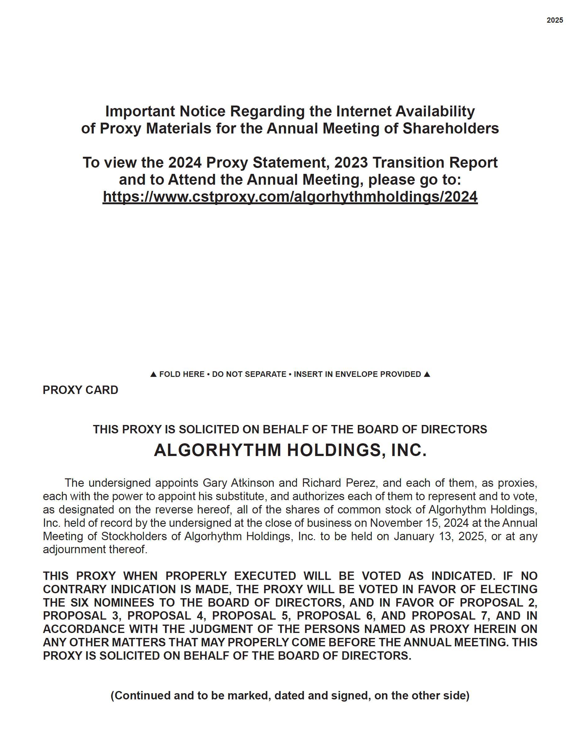 It is my pleasure to invite you to the 2024 Virtual Annual Meeting of Stockholders (the “Annual Meeting”) of Algorhythm Holdings, Inc., a Delaware corporation (the “Company,” “Algorhythm,” “us,” or “our”). The Annual Meeting will be held on January 13, 2025 at 9:00 a.m. Eastern Time virtually by means of remote communication and can be accessed by visiting www.cstproxy.com/algorhythmholdings/2024 where you will be able to listen to the meeting live, submit questions and vote online. You will not be able to attend the meeting in person.