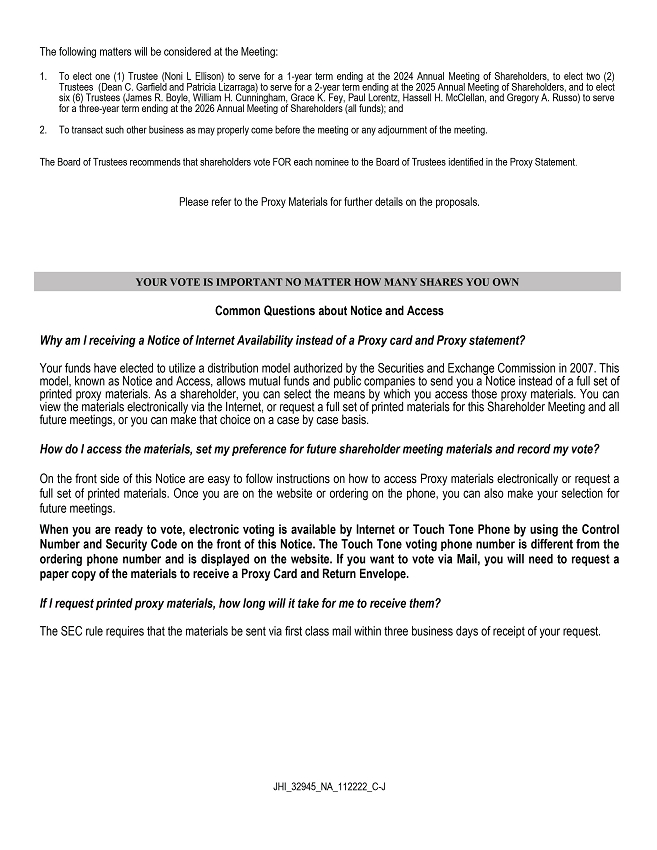 Due to the difficulties arising from the COVID-19 pandemic, the date, time, location or means of conducting the Meeting may change. In the event of such a change, the funds will announce alternative arrangements for the Meeting as soon as possible. If there are any such changes to the Meeting, the funds may not deliver additional soliciting materials to shareholders or otherwise amend the funds’ proxy materials. Instead, the funds plan to announce these changes, if any, by: (i) issuing a press release at jhinvestments.com/about-us/press-releases.com and encourage you to check this website before the meeting; and (ii) filing the announcement with the Securities and Exchange Commission. We are urging all shareholders to take advantage of voting by mail, the internet, or telephone, as provided on the attached proxy card.