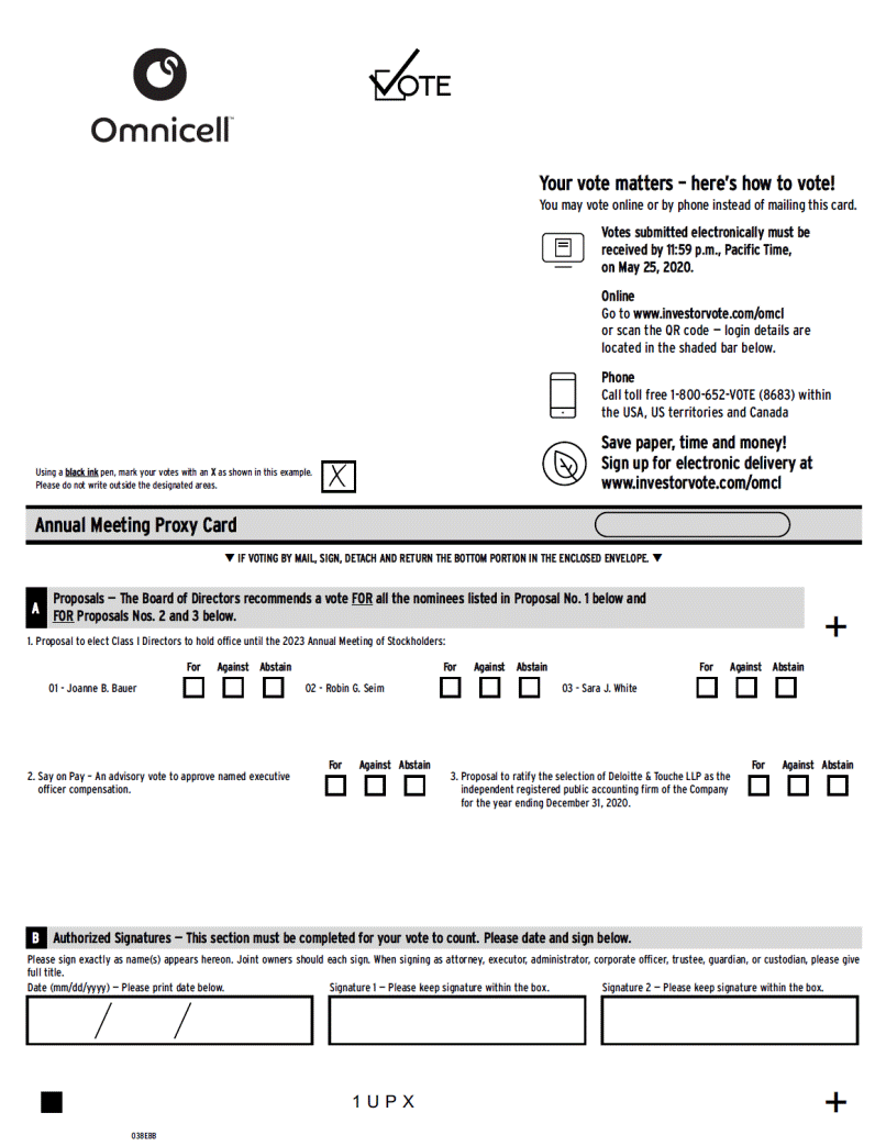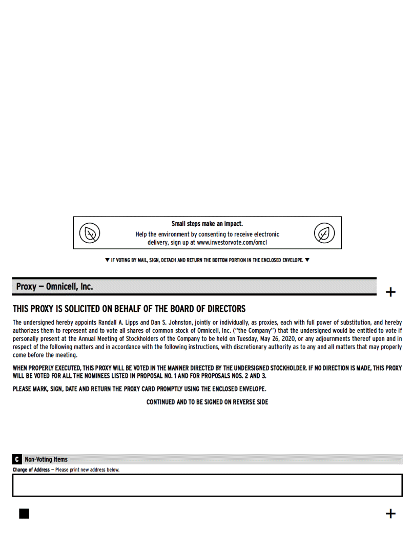 q IF VOTING BY MAIL, SIGN, DETACH AND RETURN THE BOTTOM PORTION IN THE ENCLOSED ENVELOPE. q + THIS PROXY IS SOLICITED ON BEHALF OF THE BOARD OF DIRECTORS The undersigned hereby appoints Randall A. Lipps and Dan S. Johnston, jointly or individually, as proxies, each with full power of substitution, and hereby authorizes them to represent and to vote all shares of common stock of Omnicell, Inc. (“the Company”) that the undersigned would be entitled to vote if personally present at the Annual Meeting of Stockholders of the Company to be held on Tuesday, May 26, 2020, or any adjournments thereof upon and in respect of the following matters and in accordance with the following instructions, with discretionary authority as to any and all matters that may properly come before the meeting. WHEN PROPERLY EXECUTED, THIS PROXY WILL BE VOTED IN THE MANNER DIRECTED BY THE UNDERSIGNED STOCKHOLDER. IF NO DIRECTION IS MADE, THIS PROXY WILL BE VOTED FOR ALL THE NOMINEES LISTED IN PROPOSAL NO. 1 AND FOR PROPOSALS NOS. 2 AND 3. PLEASE MARK, SIGN, DATE AND RETURN THE PROXY CARD PROMPTLY USING THE ENCLOSED ENVELOPE. CONTINUED AND TO BE SIGNED ON REVERSE SIDE Change of Address — Please print new address below. + C Non-Voting Items Proxy — Omnicell, Inc. Small steps make an impact. Help the environment by consenting to receive electronic delivery, sign up at www.investorvote.com/omcl