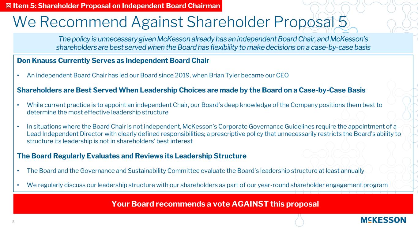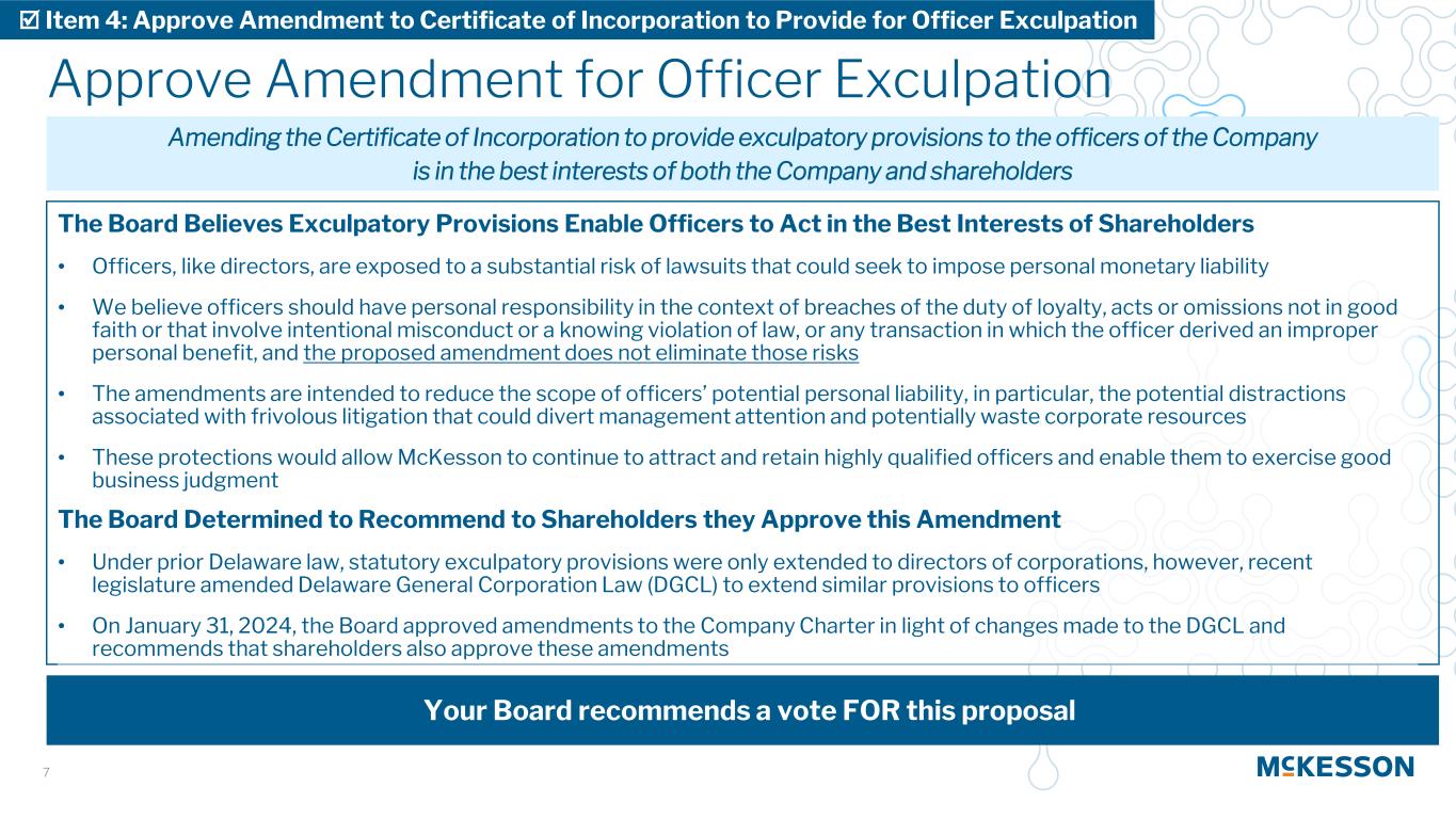 7 Amending the Certificate of Incorporation to provide exculpatory provisions to the officers of the Company is in the best interests of both the Company and shareholders The Board Believes Exculpatory Provisions Enable Officers to Act in the Best Interests of Shareholders • Officers, like directors, are exposed to a substantial risk of lawsuits that could seek to impose personal monetary liability • We believe officers should have personal responsibility in the context of breaches of the duty of loyalty, acts or omissions not in good faith or that involve intentional misconduct or a knowing violation of law, or any transaction in which the officer derived an improper personal benefit, and the proposed amendment does not eliminate those risks • The amendments are intended to reduce the scope of officers’ potential personal liability, in particular, the potential distractions associated with frivolous litigation that could divert management attention and potentially waste corporate resources • These protections would allow McKesson to continue to attract and retain highly qualified officers and enable them to exercise good business judgment The Board Determined to Recommend to Shareholders they Approve this Amendment • Under prior Delaware law, statutory exculpatory provisions were only extended to directors of corporations, however, recent legislature amended Delaware General Corporation Law (DGCL) to extend similar provisions to officers • On January 31, 2024, the Board approved amendments to the Company Charter in light of changes made to the DGCL and recommends that shareholders also approve these amendments Approve Amendment for Officer Exculpation 🗹 Item 4: Approve Amendment to Certificate of Incorporation to Provide for Officer Exculpation Your Board recommends a vote FOR this proposal