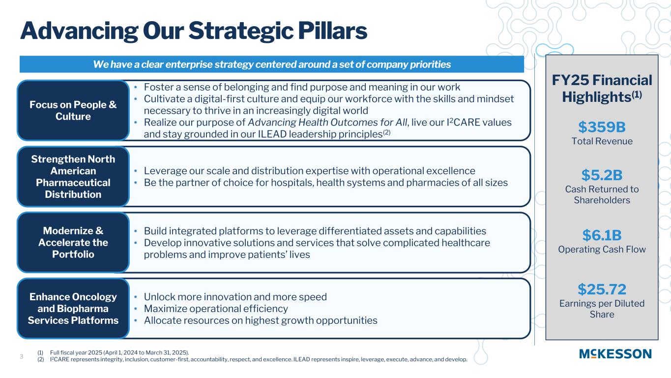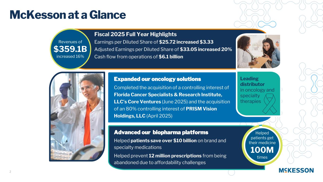 2 McKesson at a Glance Fiscal 2025 Full Year Highlights Earnings per Diluted Share of $25.72 increased $3.33 Adjusted Earnings per Diluted Share of $33.05 increased 20% Cash flow from operations of $6.1 billion Leading distributor in oncology and specialty therapies Helped patients get their medicine 100M times Revenues of $359.1B increased 16% Expanded our oncology solutions Completed the acquisition of a controlling interest of Florida Cancer Specialists & Research Institute, LLC’s Core Ventures (June 2025) and the acquisition of an 80% controlling interest of PRISM Vision Holdings, LLC (April 2025) Advanced our biopharma platforms Helped patients save over $10 billion on brand and specialty medications Helped prevent 12 million prescriptions from being abandoned due to affordability challenges