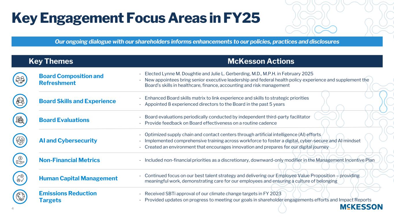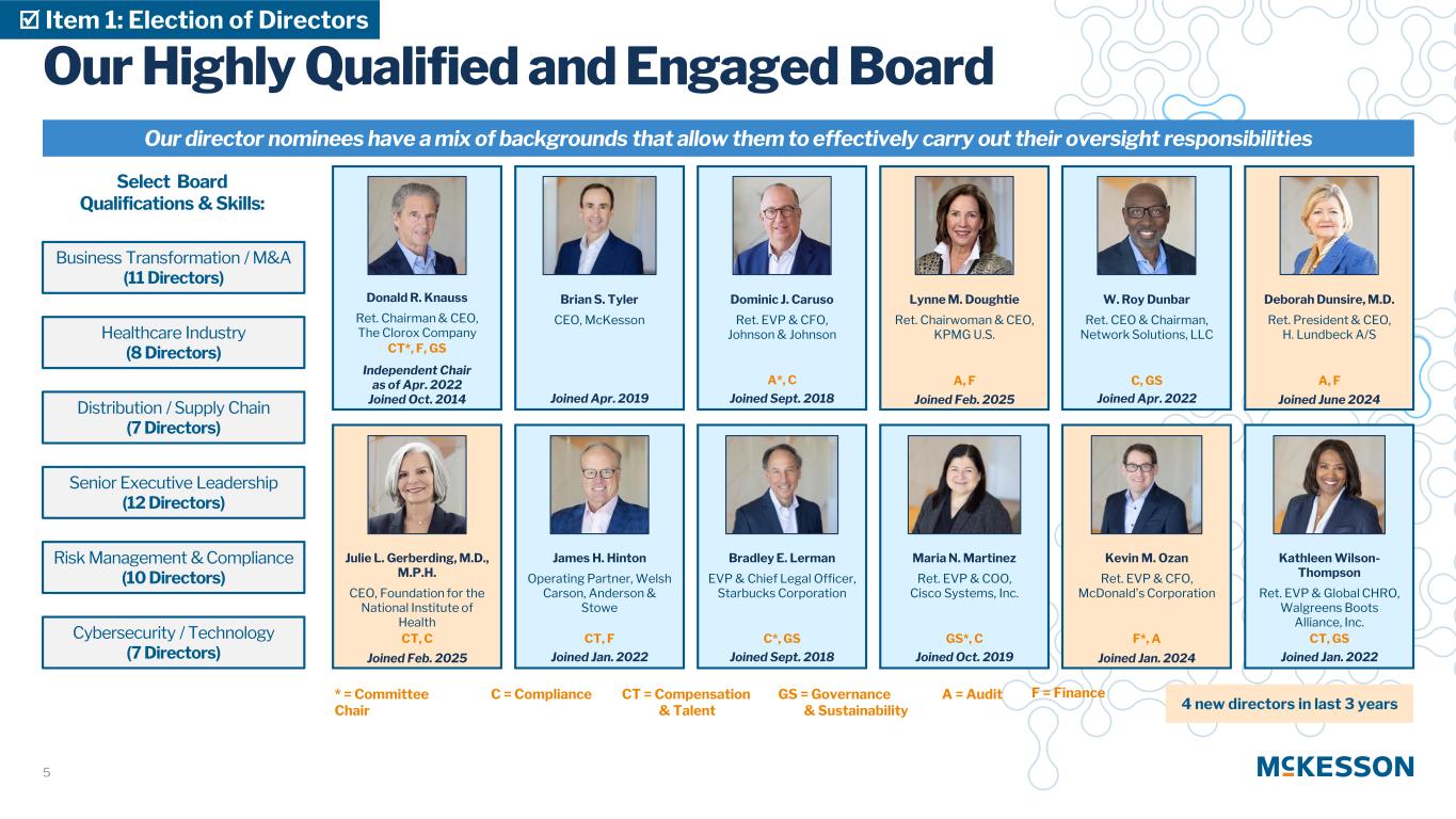 Focus on Good Corporate GovernanceKey Engagement F cus Areas in FY25 Key Themes McKesson Actions Board Composition and Refreshment Non-Financial Metrics Human Capital Management Emissions Reduction Targets Board Skills and Experience Board Evaluations AI and Cybersecurity - Elected Lynne M. Doughtie and Julie L. Gerberding, M.D., M.P.H. in February 2025 - New appointees bring senior executive leadership and federal health policy experience and supplement the Board’s skills in healthcare, finance, accounting and risk management - Included non-financial priorities as a discretionary, downward-only modifier in the Management Incentive Plan - Continued focus on our best talent strategy and delivering our Employee Value Proposition – providing meaningful work, demonstrating care for our employees and ensuring a culture of belonging - Received SBTi approval of our climate change targets in FY 2023 - Provided updates on progress to meeting our goals in shareholder engagements efforts and Impact Reports - Enhanced Board skills matrix to link experience and skills to strategic priorities - Appointed 8 experienced directors to the Board in the past 5 years - Board evaluations periodically conducted by independent third-party facilitator - Provide feedback on Board effectiveness on a routine cadence - Optimized supply chain and contact centers through artificial intelligence (AI) efforts - Implemented comprehensive training across workforce to foster a digital, cyber-secure and AI mindset - Created an environment that encourages innovation and prepares for our digital journey Our ongoing dialogue with our shareholders informs enhancements to our policies, practices and disclosures 4
