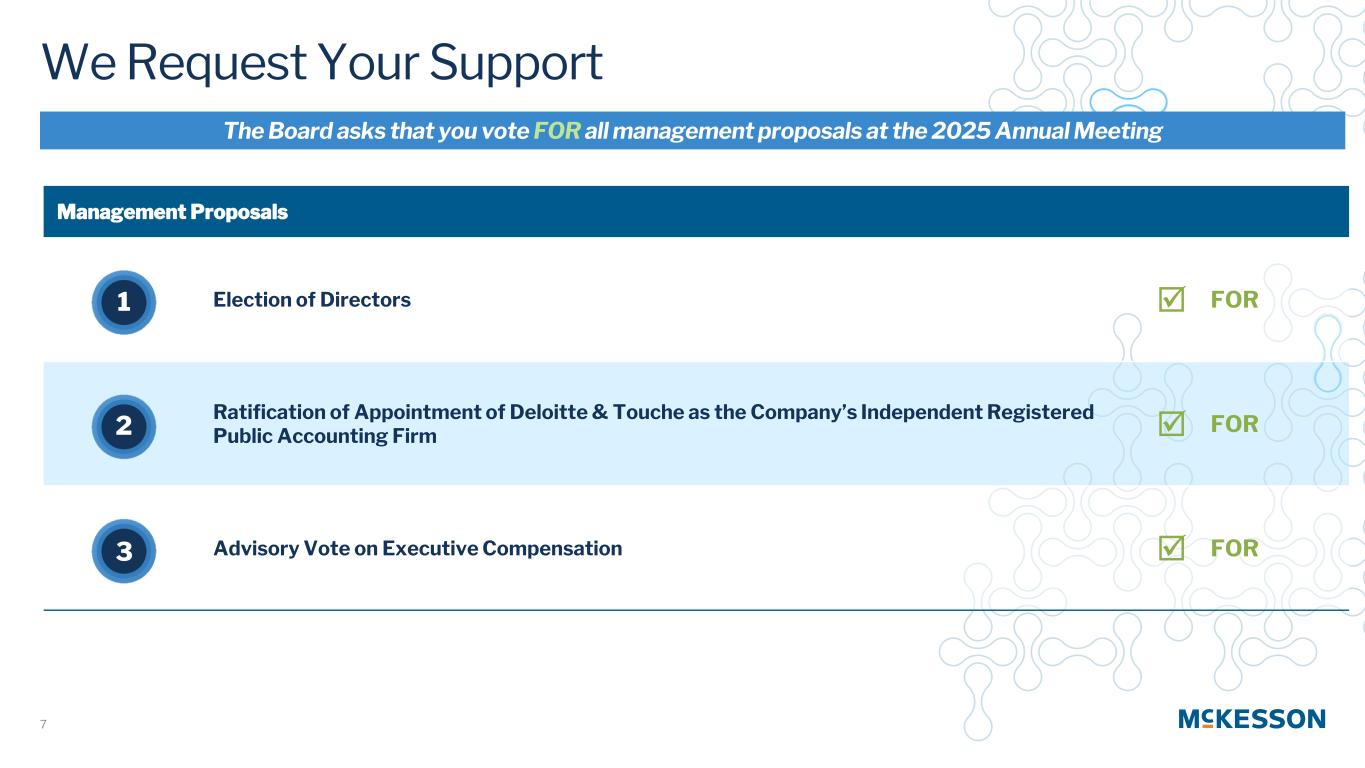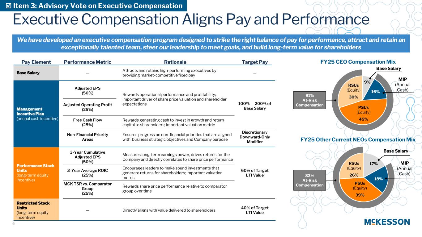 Base Salary MIP (Annual Cash) PSUs (Equity) 45% RSUs (Equity) 30% Base Salary MIP (Annual Cash) PSUs (Equity) 39% RSUs (Equity) 26% 6 Executive Compensation Aligns Pay and Performance We have developed an executive compensation program designed to strike the right balance of pay for performance, attract and retain an exceptionally talented team, steer our leadership to meet goals, and build long-term value for shareholders FY25 CEO Compensation Mix 9% 16% FY25 Other Current NEOs Compensation Mix 91% At-Risk Compensation Pay Element Performance Metric Rationale Target Pay Base Salary — Attracts and retains high-performing executives by providing market-competitive fixed pay — Management Incentive Plan (annual cash incentive) Adjusted EPS (50%) Rewards operational performance and profitability; important driver of share price valuation and shareholder expectations 100% — 200% of Base Salary Adjusted Operating Profit (25%) Free Cash Flow (25%) Rewards generating cash to invest in growth and return capital to shareholders; important valuation metric Non-Financial Priority Areas Ensures progress on non-financial priorities that are aligned with business strategic objectives and Company purpose Discretionary Downward-Only Modifier Performance Stock Units (long-term equity incentive) 3-Year Cumulative Adjusted EPS (50%) Measures long-term earnings power, drives returns for the Company and directly correlates to share price performance 60% of Target LTI Value 3-Year Average ROIC (25%) Encourages leaders to make sound investments that generate returns for shareholders; important valuation metric MCK TSR vs. Comparator Group (25%) Rewards share price performance relative to comparator group over time Restricted Stock Units (long-term equity incentive) — Directly aligns with value delivered to shareholders 40% of Target LTI Value 17% 18% 83% At-Risk Compensation 🗹 Item 3: Advisory Vote on Executive Compensation