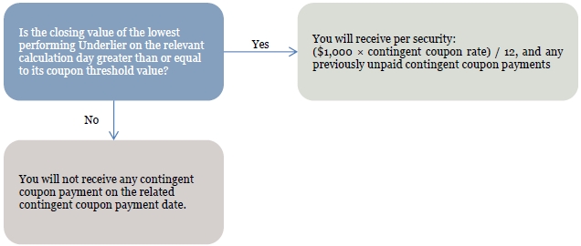 On each contingent coupon payment date, unless the securities have been automatically called, you will receive a contingent coupon payment at a per annum rate equal to the contingent coupon rate if, and only if, the closing value of the lowest performing Underlier on the related calculation day is greater than or equal to its coupon threshold value. In addition, if the closing value of the lowest performing Underlier on one or more calculation days is less than its coupon threshold value and, on a subsequent calculation day, the closing value of the lowest performing Underlier on that subsequent calculation day is greater than or equal to its coupon threshold value, on the contingent coupon payment date related to that subsequent calculation day, you will receive the contingent coupon payment due for that subsequent calculation day plus all previously unpaid contingent coupon payments (without interest on amounts previously unpaid).