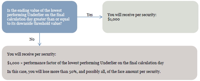 • if the ending value of the lowest performing Underlier on the final calculation day is less than its downside threshold value: