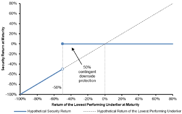 The above figures are for purposes of illustration only and may have been rounded for ease of analysis. If the securities are not automatically called prior to the stated maturity date, the actual amount you will receive at stated maturity will depend on the actual ending value of the lowest performing Underlier on the final calculation day. The performance of the better performing Underliers is not relevant to your return on the securities.