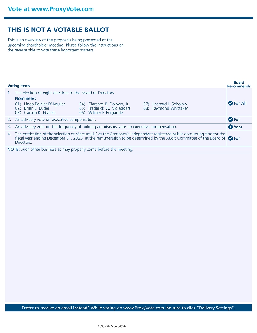 Vote at www.ProxyVote.comTHIS IS NOT A VOTABLE BALLOT This is an overview of the proposals being presented at the upcoming shareholder meeting. Please follow the instructions on the reverse side to vote these important matters.Voting Items 1. The election of eight directors to the Board of Directors. Nominees:Board Recommends01) Linda Beidler-D’Aguilar 02) Brian E. Butler 03) Carson K. Ebanks04) Clarence B. Flowers, Jr. 05) Frederick W. McTaggart 06) Wilmer F. Pergande07) Leonard J. Sokolow 08) Raymond WhittakerFor All2. An advisory vote on executive compensation. 3. An advisory vote on the frequency of holding an advisory vote on executive compensation. 4. The ratification of the selection of Marcum LLP as the Company’s independent registered public accounting firm for the fiscal year ending December 31, 2023, at the remuneration to be determined by the Audit Committee of the Board of Directors. NOTE: Such other business as may properly come before the meeting.For 1 Year ForPrefer to receive an email instead? While voting on www.ProxyVote.com, be sure to click “Delivery Settings”.V10695-P89770-Z84596