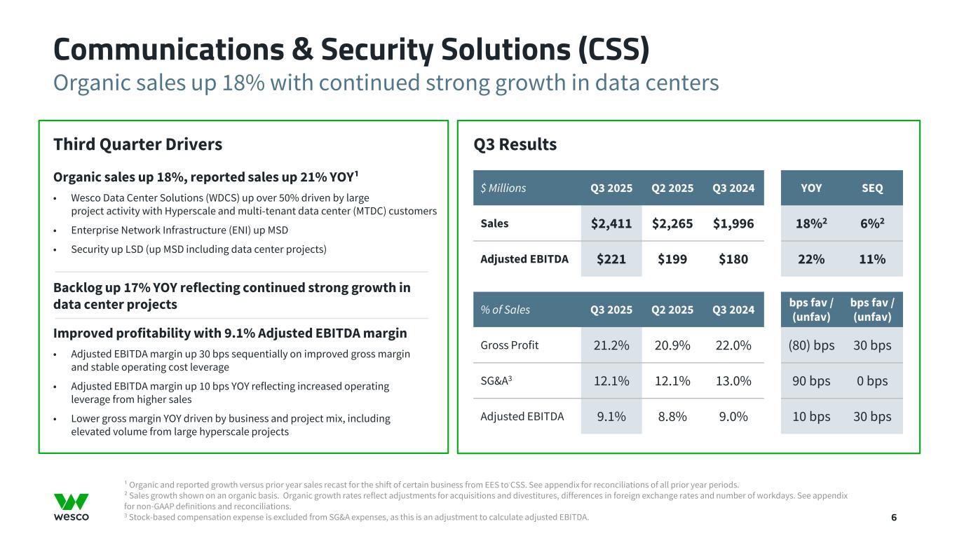 ¹ Organic and reported growth versus prior year sales recast for the shift of certain business from EES to CSS. See appendix for reconciliations of all prior year periods. ² Sales growth shown on an organic basis. Organic growth rates reflect adjustments for acquisitions and divestitures, differences in foreign exchange rates and number of workdays. See appendix for non-GAAP definitions and reconciliations. 3 Stock-based compensation expense is excluded from SG&A expenses, as this is an adjustment to calculate adjusted EBITDA. Organic sales up 12% with continued growth across Construction, Industrial and OEM Electrical & Electronic Solutions (EES) 5 Q3 Results Third Quarter Drivers Organic and reported sales up 12% YOY1 • Construction up mid-teens driven by strong wire and cable demand and continued infrastructure projects • Industrial up MSD driven by improved day-to-day demand in the U.S. and increased project activity in Canada • OEM up mid-teens reflecting strong growth in both the U.S. and Canada • Data center sales up ~60% YOY representing ~6% of EES sales Backlog flat YOY Improved profitability with 8.4% Adjusted EBITDA margin • Adjusted EBITDA margin up 30 bps sequentially on improved gross margin and stable operating cost leverage • Lower gross margin YOY driven by project activity and product mix $ Millions Q3 2025 Q2 2025 Q3 2024 YOY SEQ Sales $2,360 $2,258 $2,110 12%2 4%2 Adjusted EBITDA $198 $183 $181 9% 8% % of Sales Q3 2025 Q2 2025 Q3 2024 bps fav / (unfav) bps fav / (unfav) Gross Profit 23.3% 23.0% 24.3% (100) bps 30 bps SG&A3 14.9% 14.9% 15.7% 80 bps 0 bps Adjusted EBITDA 8.4% 8.1% 8.6% (20) bps 30 bps