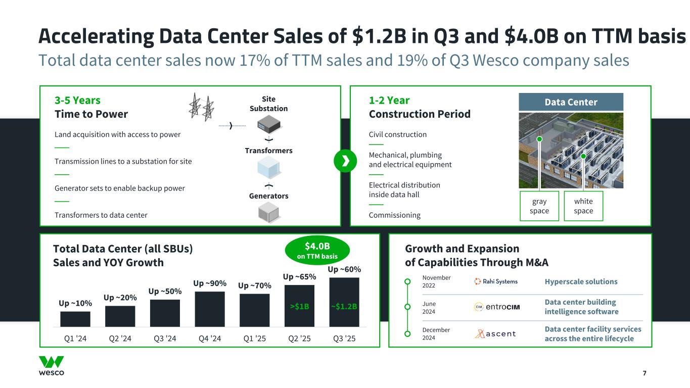 Total data center sales now 17% of TTM sales and 19% of Q3 Wesco company sales Accelerating Data Center Sales of $1.2B in Q3 and $4.0B on TTM basis 7 Up ~10% Up ~20% Up ~50% Up ~90% Up ~70% Up ~65% Up ~60% Q1 '24 Q2 '24 Q3 '24 Q4 '24 Q1 '25 Q2 '25 Q3 '25 Growth and Expansion of Capabilities Through M&A Data Center Land acquisition with access to power Transmission lines to a substation for site Generator sets to enable backup power Transformers to data center Civil construction Mechanical, plumbing and electrical equipment Electrical distribution inside data hall Commissioning November 2022 Hyperscale solutions Data center building intelligence software June 2024 Data center facility services across the entire lifecycle December 2024 3-5 Years Time to Power 1-2 Year Construction Period Total Data Center (all SBUs) Sales and YOY Growth white space gray space Transformers Site Substation Generators >$1B ~$1.2B $4.0B on TTM basis