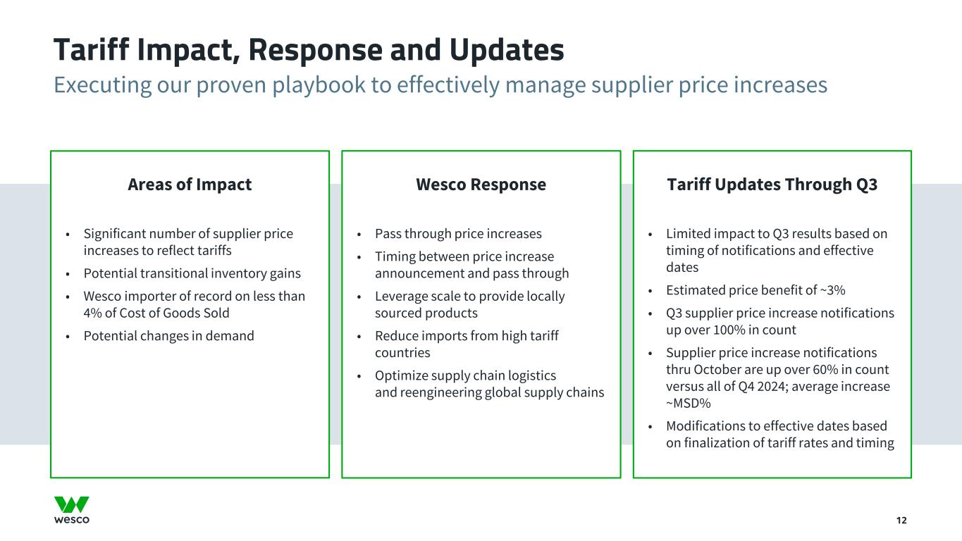 Executing our proven playbook to effectively manage supplier price increases Tariff Impact, Response and Updates 12 Areas of Impact • Significant number of supplier price increases to reflect tariffs • Potential transitional inventory gains • Wesco importer of record on less than 4% of Cost of Goods Sold • Potential changes in demand Wesco Response • Pass through price increases • Timing between price increase announcement and pass through • Leverage scale to provide locally sourced products • Reduce imports from high tariff countries • Optimize supply chain logistics and reengineering global supply chains Tariff Updates Through Q3 • Limited impact to Q3 results based on timing of notifications and effective dates • Estimated price benefit of ~3% • Q3 supplier price increase notifications up over 100% in count • Supplier price increase notifications thru October are up over 60% in count versus all of Q4 2024; average increase ~MSD% • Modifications to effective dates based on finalization of tariff rates and timing