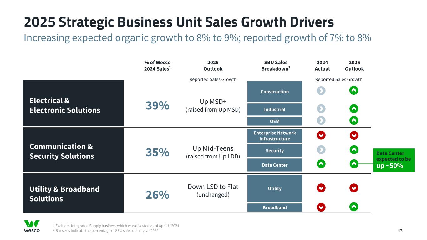 1 Excludes Integrated Supply business which was divested as of April 1, 2024. 2 Bar sizes indicate the percentage of SBU sales of full year 2024. Increasing expected organic growth to 8% to 9%; reported growth of 7% to 8% 2025 Strategic Business Unit Sales Growth Drivers 13 % of Wesco 2024 Sales1 2025 Outlook SBU Sales Breakdown2 2024 Actual 2025 Outlook Reported Sales Growth Reported Sales Growth Electrical & Electronic Solutions 39% Up MSD+ (raised from Up MSD) Construction Industrial OEM Communication & Security Solutions 35% Up Mid-Teens (raised from Up LDD) Enterprise Network Infrastructure Security Data Center Utility & Broadband Solutions 26% Down LSD to Flat (unchanged) Utility Broadband Data Center expected to be up ~50% Construction Industrial OEM Utility Broadband Enterprise Network Infrastructure Security Data Center